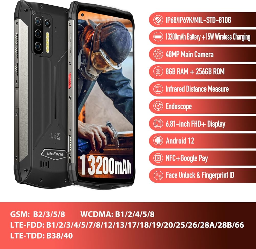 【MTK Helio G95 & 8GB+256GB】يتم تشغيل Ulefone Power Armor 13 بواسطة شريحة MediaTek Helio G95، مقترنة بذاكرة وصول عشوائي سعتها 8 جيجابايت قادرة على تشغيل مقاطع الفيديو متعددة المهام بسلاسة قدر الإمكان. مساحة تخزين داخلية 256 جيجابايت (يدعم الذاكرة الخارجية). يعمل بأحدث نظام تشغيل Android 12 (💕غير متوافق مع عمليات تنشيط AT&T أو Cricket)