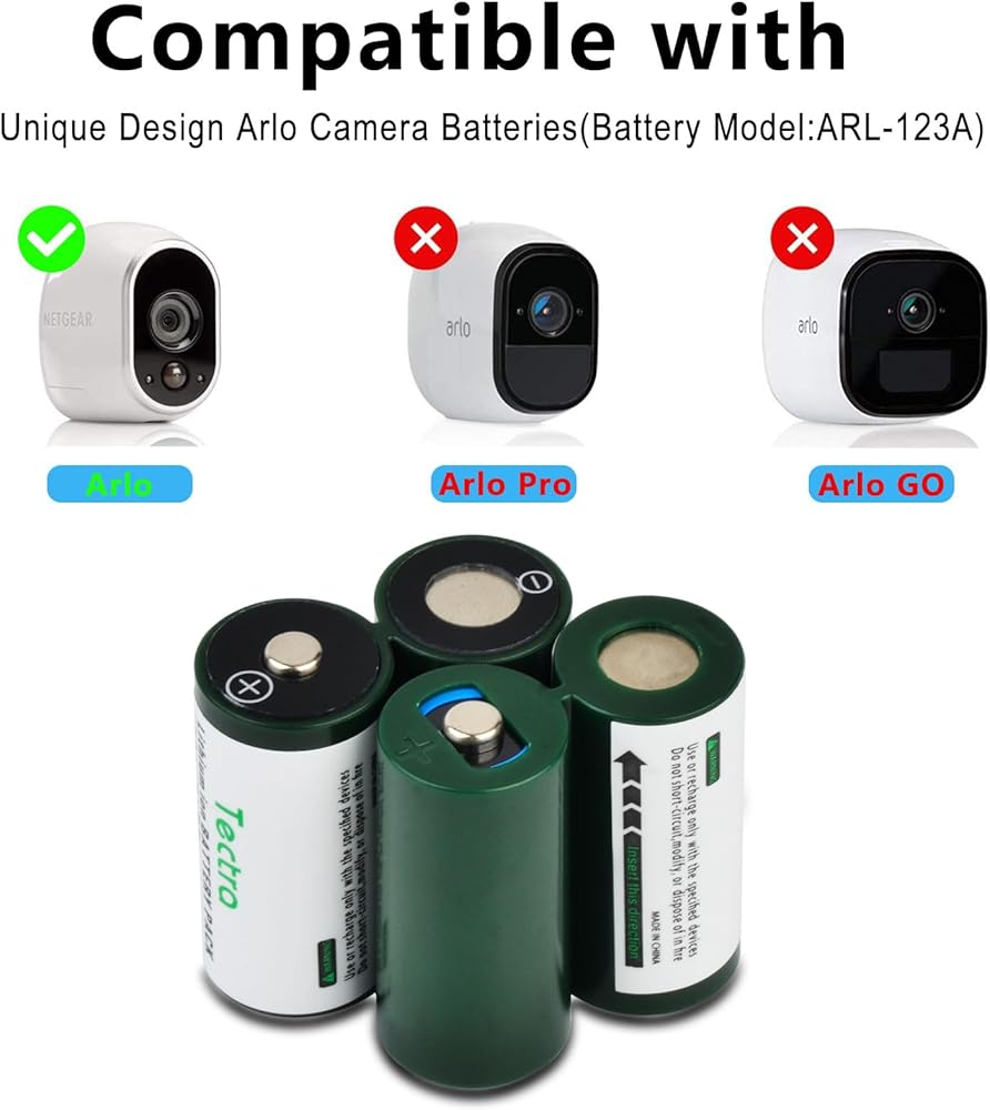 متوافق مع: حزمة بطاريات ليثيوم 123A قابلة لإعادة الشحن مصممة خصيصًا، تعمل فقط مع كاميرات الأمان Arlo VMC3030/VMK3200/VMS3330/3430/3530. غير متوافق مع كاميرا Arlo Ultra وArlo Go وArlo Pro 2، يرجى التحقق من رقم طراز الكاميرا بعناية قبل الشراء.