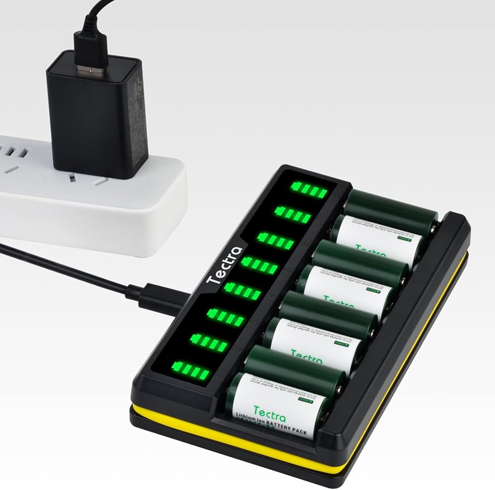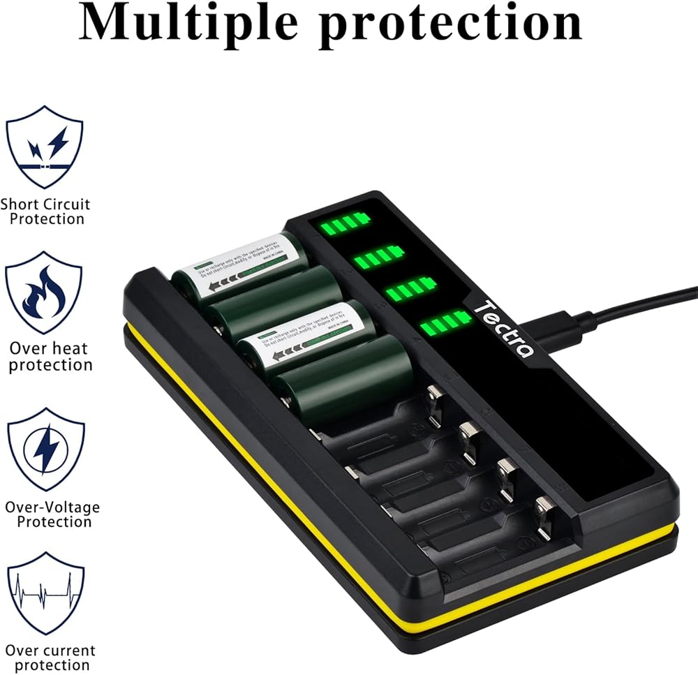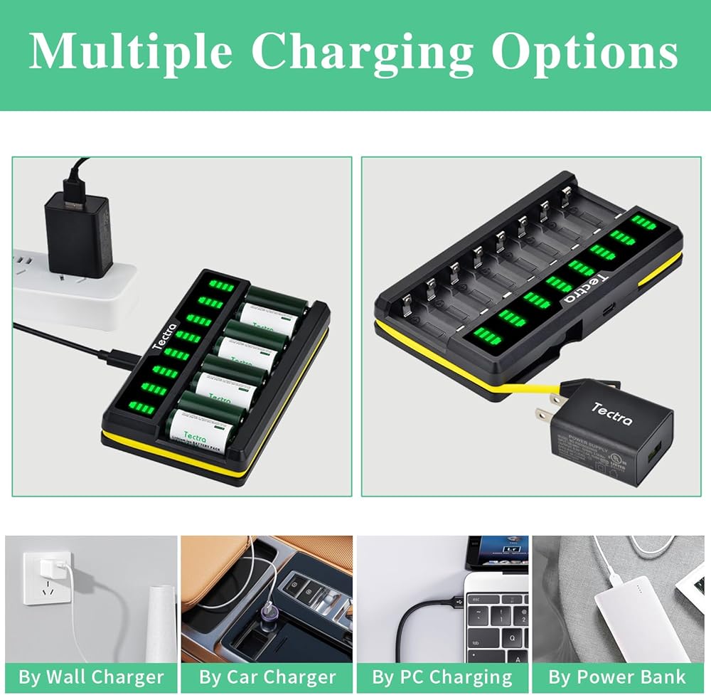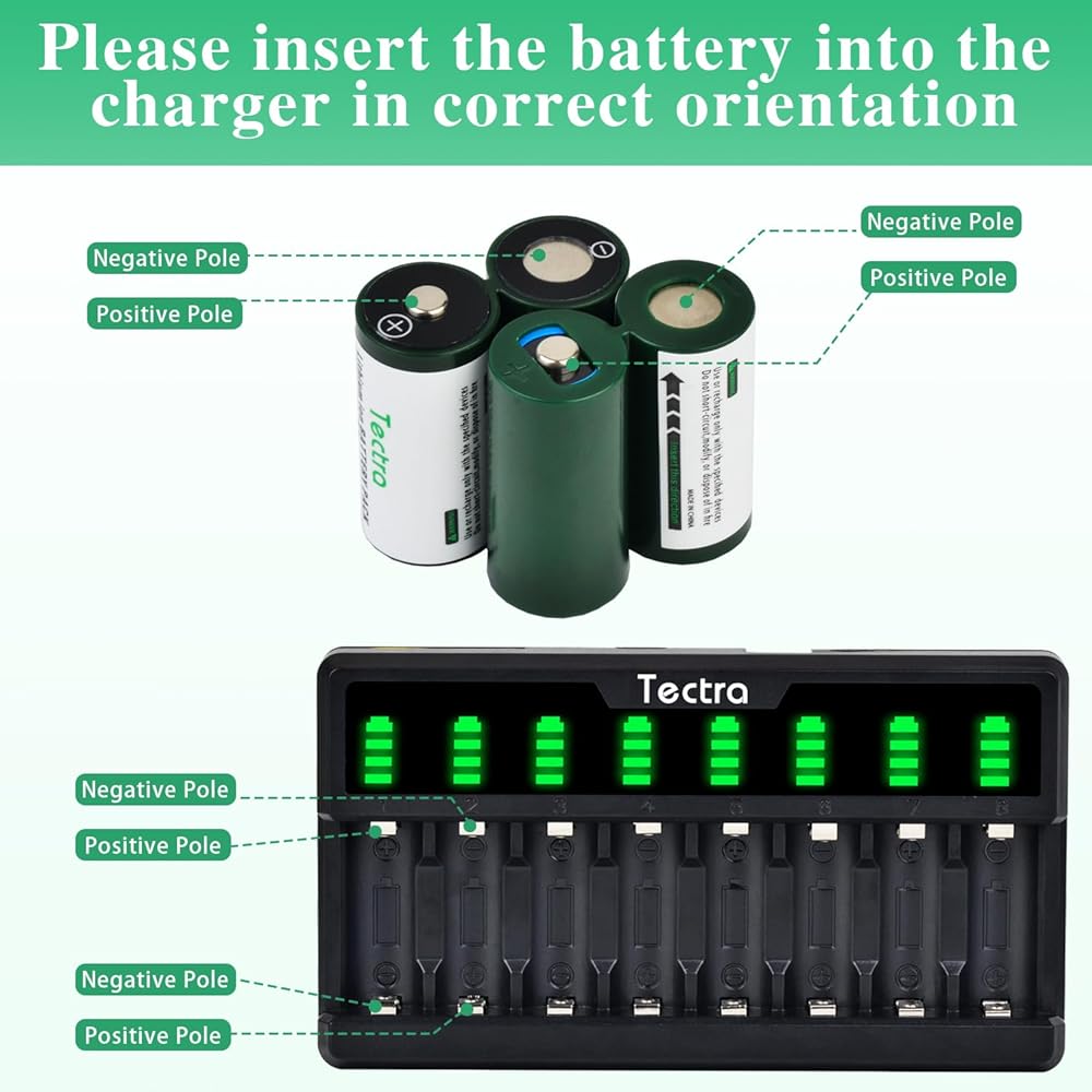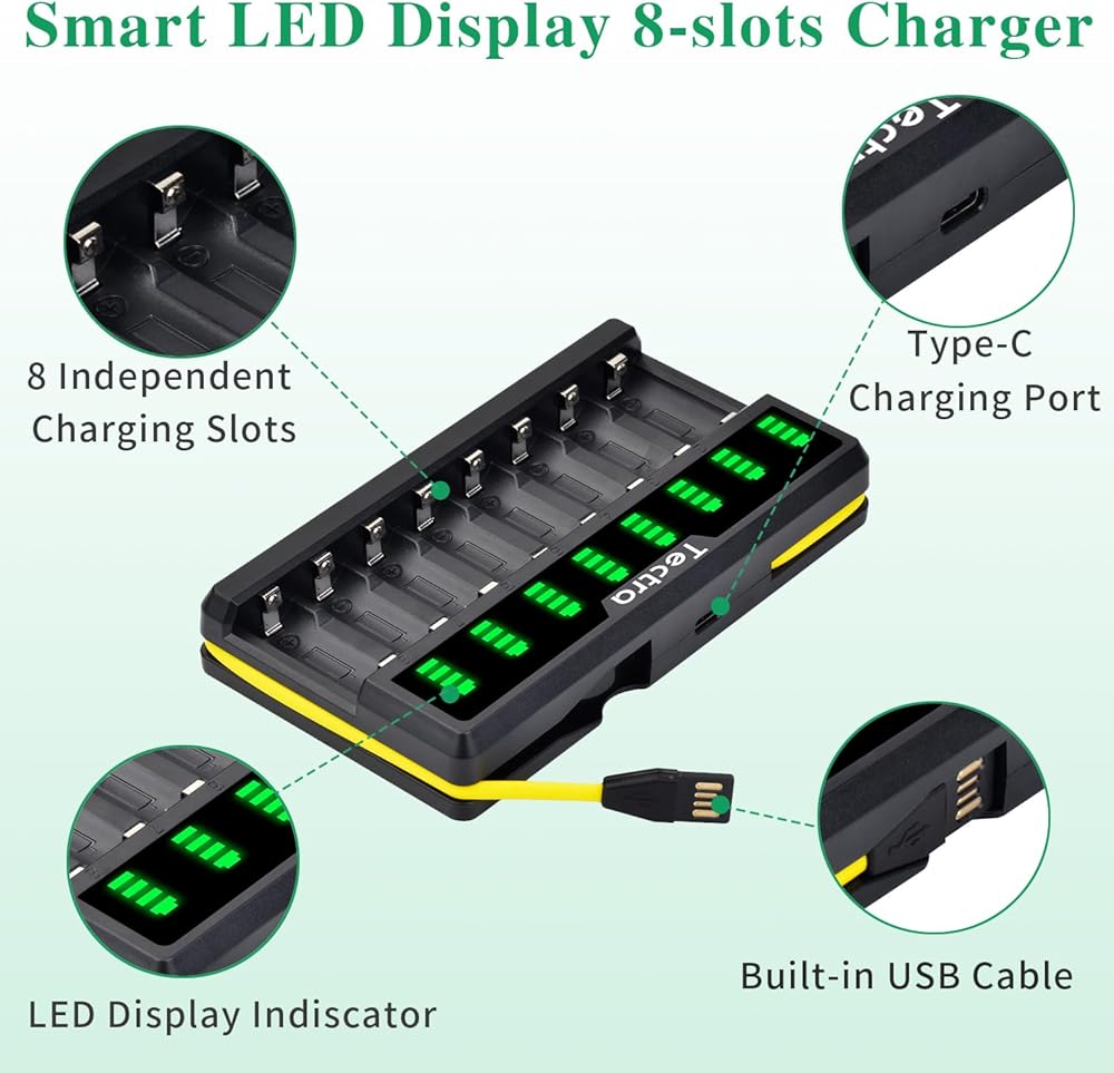【شاحن ذكي ذو 8 فتحات وشاشة LED 】تيار شحن تيار مستمر 5 فولت 2 أمبير، تصميم فتحات شحن مستقلة، يمكنه شحن 8 بطاريات بشكل مستقل أو في وقت واحد. ستظهر لك مؤشرات LED الأربعة عملية شحن البطارية بالكامل. الشاحن مزود بمنفذ USB مدمج كابل ومنفذ من النوع C، يمكن شحنه بواسطة محول USB أو بنك الطاقة أو الأجهزة الأخرى (لا تشحن البطاريات غير القابلة لإعادة الشحن)