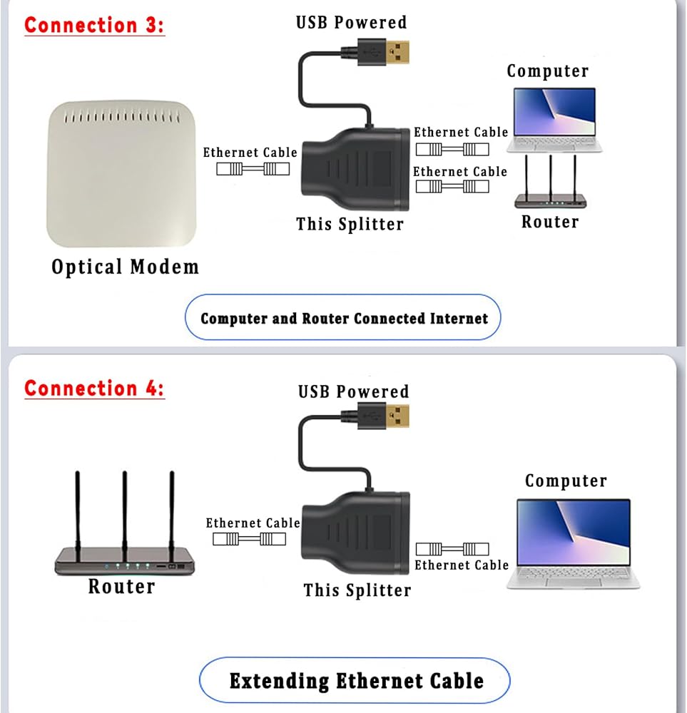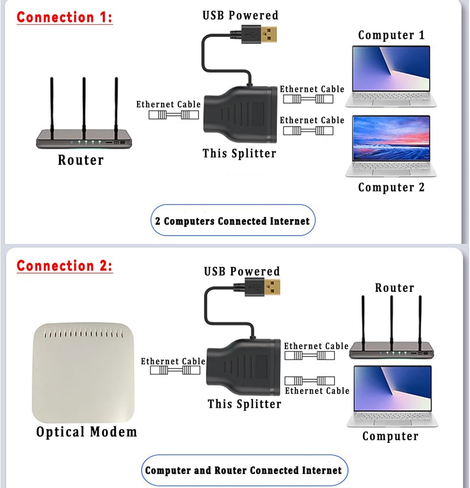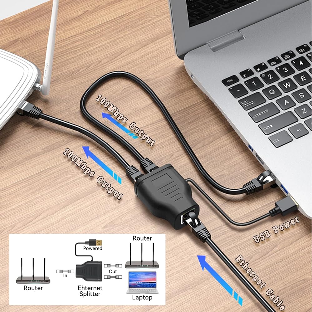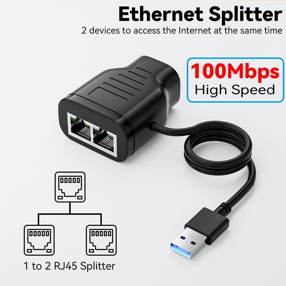 مفتاح إيثرنت بمنفذين: يدعم مقسم كابل إيثرنت سرعة شبكة تصل إلى 100 ميجابت في الثانية لكل منفذ إخراج، ويمكنك الاستمتاع بالوصول إلى الإنترنت عالي السرعة على جهازين (مثل الكمبيوتر المحمول والواي فاي) في نفس الوقت.