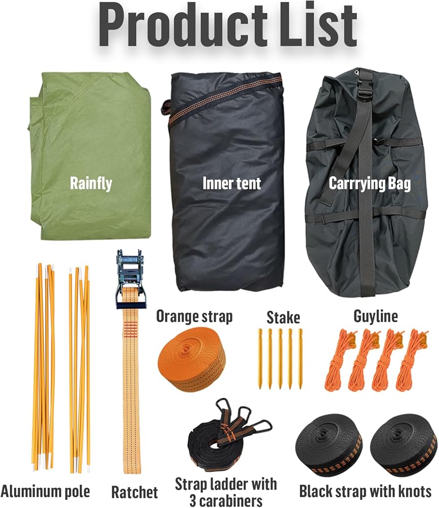 【قائمة المنتجات】وزن العبوة: 13 رطلاً. حجم العبوة: 22 × 8.7 × 7.9 بوصة. تحتوي العبوة على: حقيبة حمل * قطعة واحدة، ذبابة مطر * قطعة واحدة، خيمة داخلية * قطعة واحدة، عمود ألومنيوم * قطعتين، حزام برتقالي * قطعة واحدة، قطعة سقاطة، حزام أسود بعقد * قطعتين، سلم حزام مع 3 حلقات تسلق * قطعة واحدة، جويلاين * 5 قطع، أوتاد * 5 قطع.