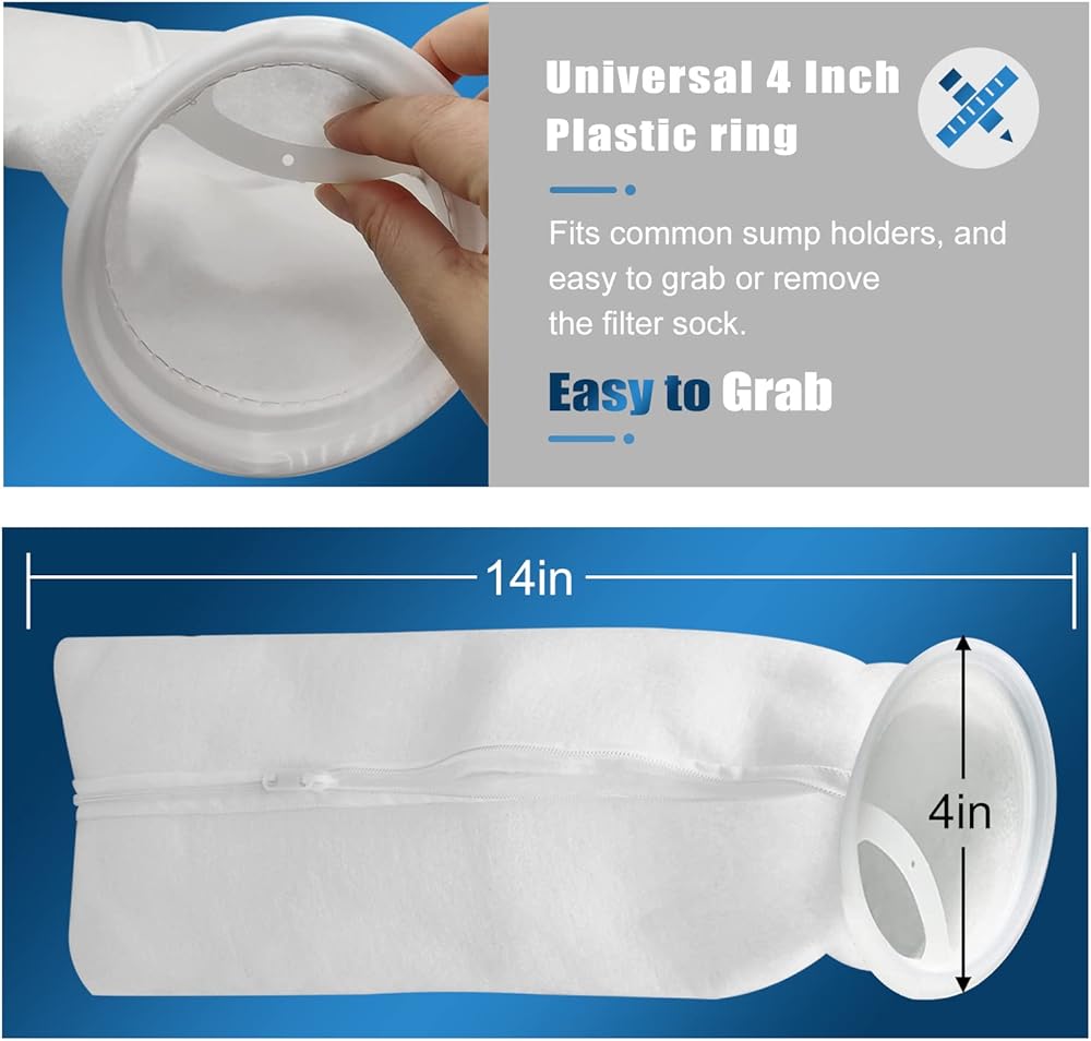 【عملية ومتعددة الاستخدامات】 سوف تحصل على قطعتين من جوارب الفلتر بسحاب بطول 4 انش × 14 انش، حلقة بلاستيكية بقطر 4 انش لاستيعاب معظم أحواض السمك المثبتة في حوض السمك وحوض الأسماك وحمامات السباحة والصناعة، مناسبة لتعليق جوارب الترشيح.