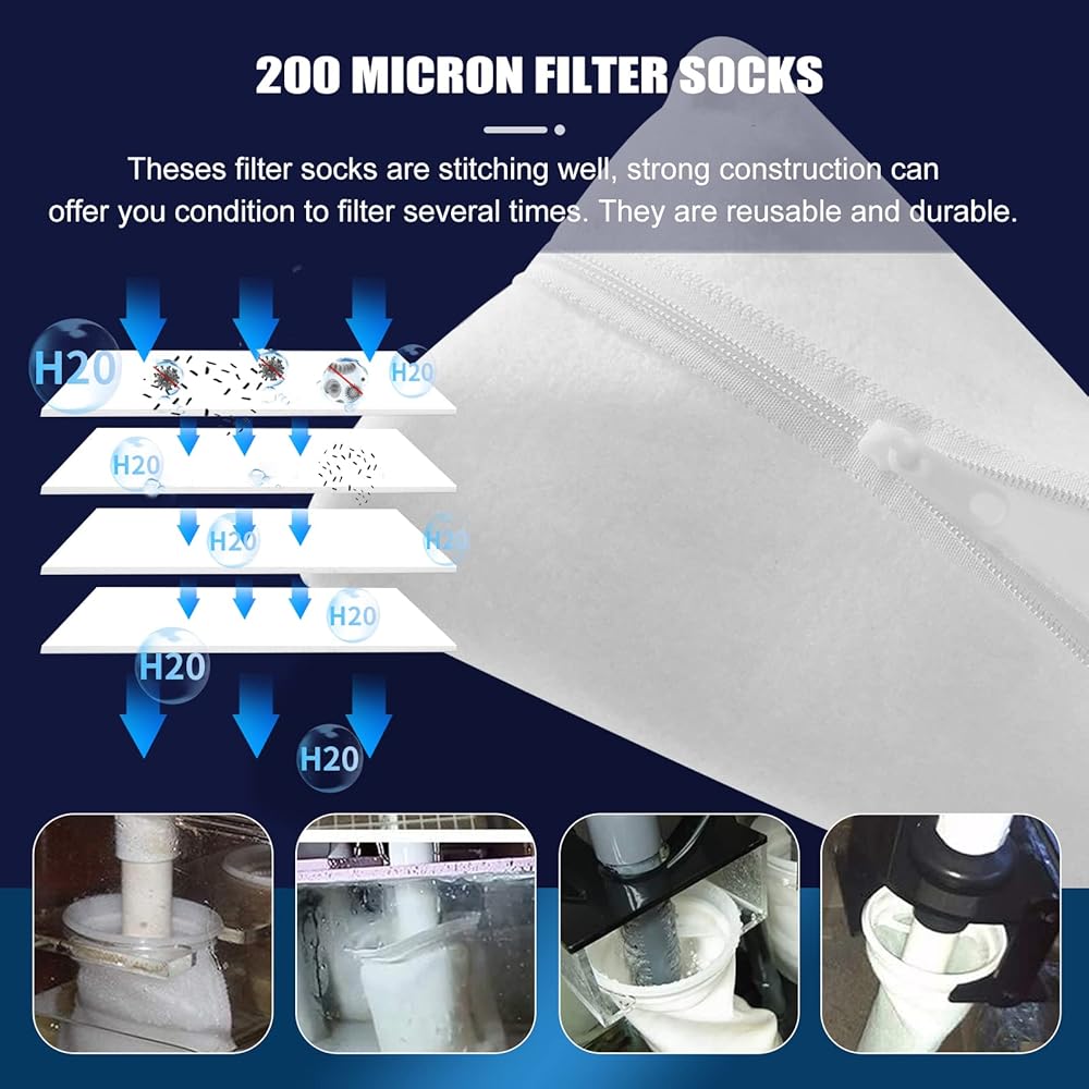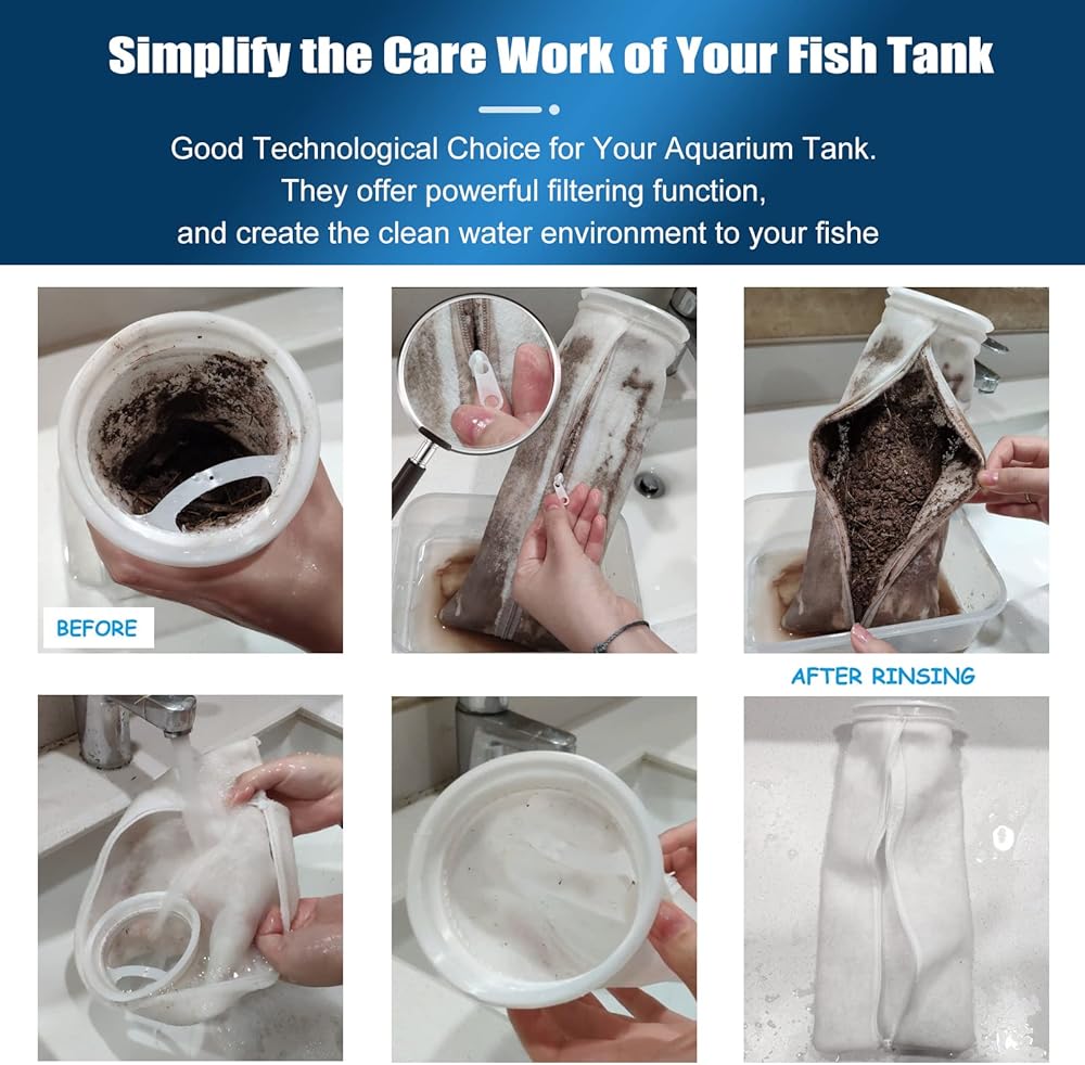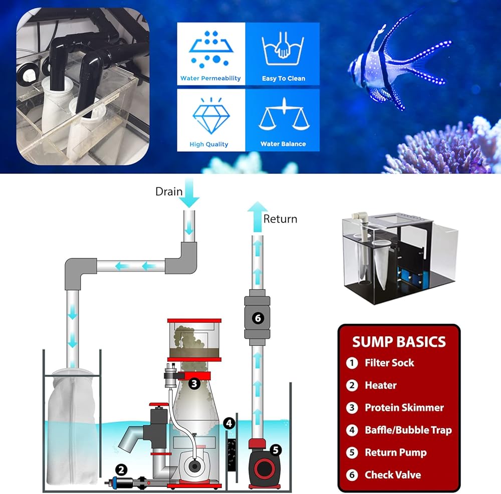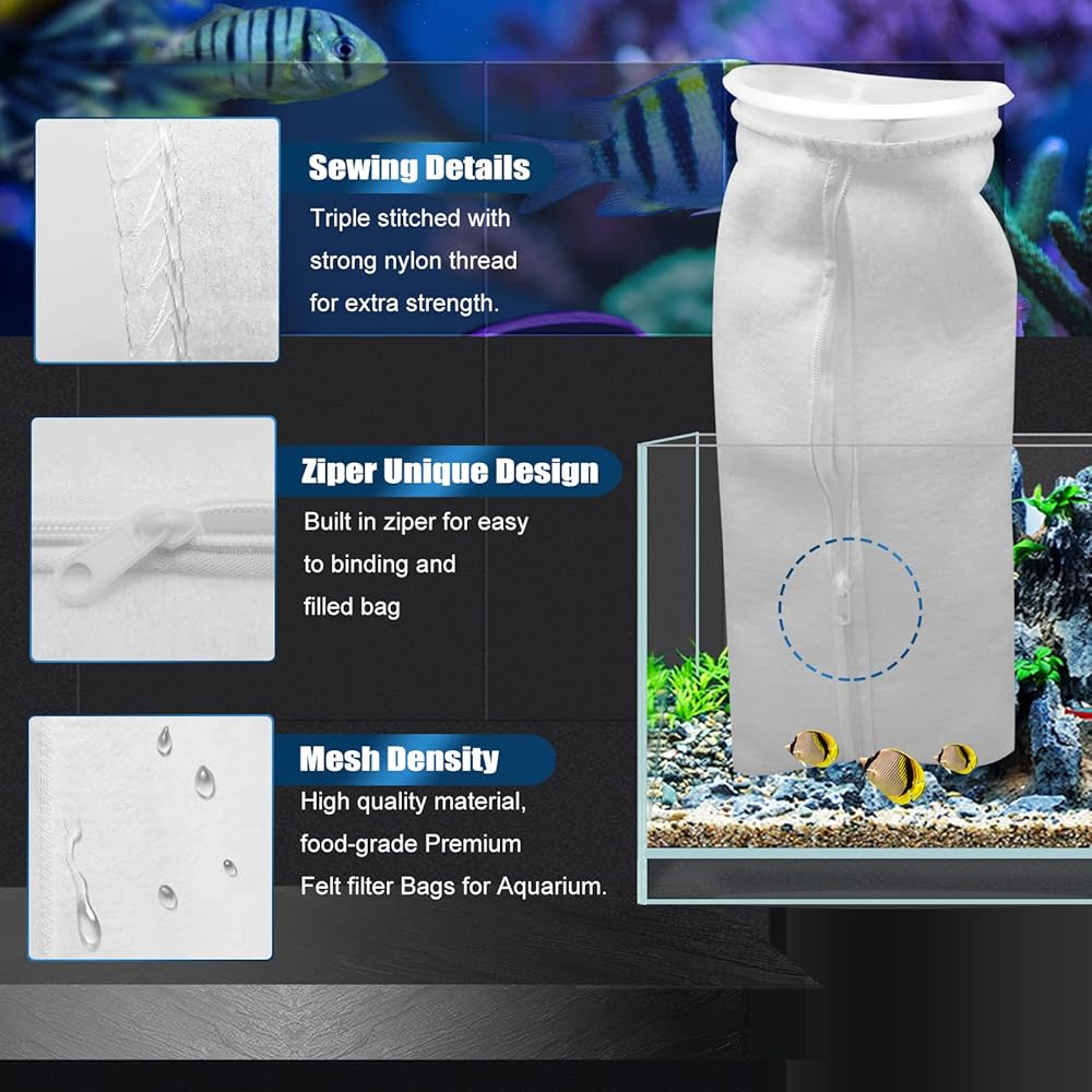【جودة عالية وقابلة لإعادة الاستخدام】 حقيبة الفلتر مصنوعة من ألياف البوليستر عالية الجودة، وهي قوية ومقاومة للاهتراء ومتينة بما يكفي لغسلها بشكل متكرر. يوصى بتنظيفها في أسبوع، وربما حتى كل أسبوعين، اعتمادًا على حجم الشعاب المرجانية.