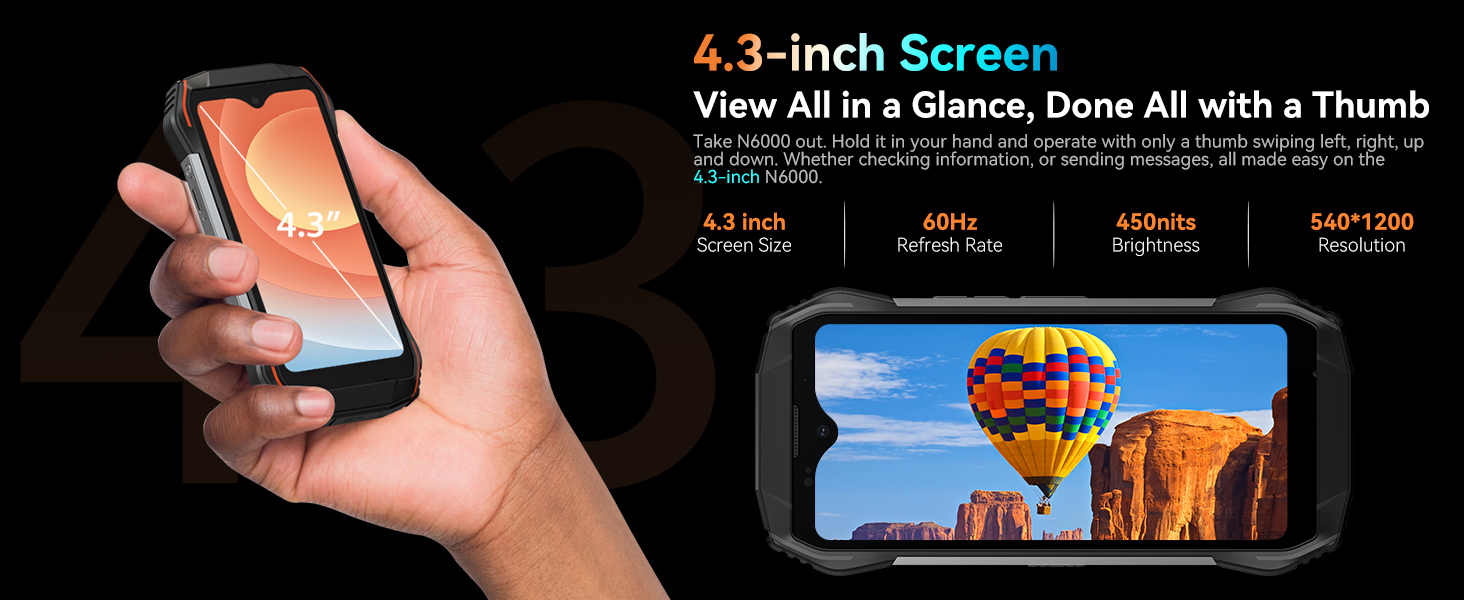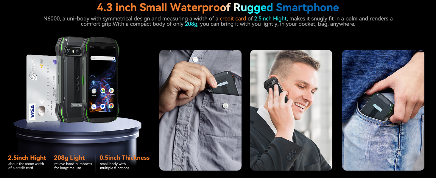 【هاتف صغير مقاس 4.3 بوصة وصغير مثل بطاقة الائتمان】Blackview N6000، هاتف متين صغير الحجم وعرضه 2.5 بوصة فقط، وهو مشابه لعرض بطاقة الائتمان. أصبح كل ذلك سهلاً على شاشة N6000 مقاس 4.3 بوصة، والتي تعمل فقط من خلال تمرير الإبهام إلى اليسار واليمين والأعلى والأسفل. بفضل هيكله المدمج الذي يبلغ وزنه 208 جرامًا فقط، يمكنك وضعه في جيبك أو حقيبتك. يوفر الهاتف المتين N6000 المقاوم للماء، الذي يحتوي على شاشة QHD+ بدقة 540*1200 وسطوع 450 شمعة في المتر المربع، صورة واقعية.