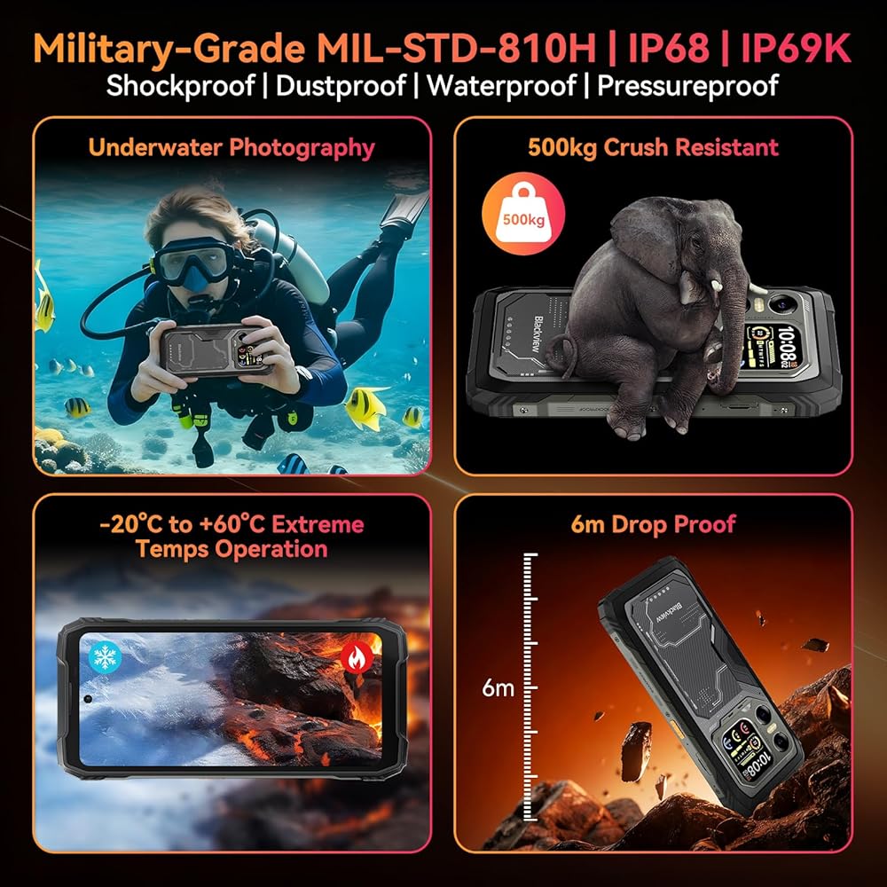 【شهادة احترافية】تم تصميم هواتف N6000 المتينة باستخدام زجاج CORNING GORILLA GLASS 5 كشاشة لحمايتها من الشقوق والخدوش السميكة الناجمة عن السقوط العرضي. يتمتع الهاتف الذكي N6000 المتين بشهادة IP68 وIP69K الاحترافية المقاومة للماء من الدرجة العسكرية ومقاوم للسقوط MIL-STD-810H، ومعتمد للحماية من مجموعة واسعة من حالات السقوط العرضي أو الصدمات أو حتى الكسر. مع القدرة على تحمل السقوط من ارتفاع 5 أمتار على الأرض ومقاوم للماء حتى عمق 1.5 متر لمدة 30 دقيقة.