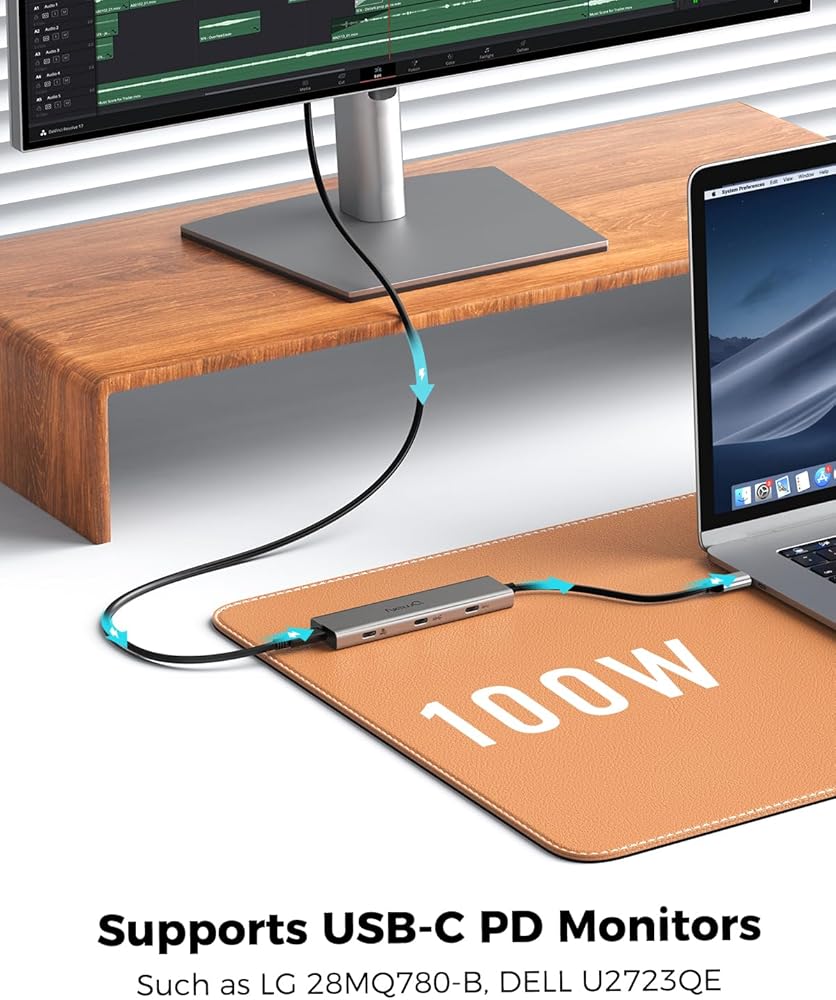 للشاشة التي تعمل بالطاقة من النوع C: يدعم هذا المحور شاشة USB C التي تعمل بالطاقة العكسية. تأكد من أن شاشتك من النوع c تدعم تشغيل أجهزة الكمبيوتر المحمولة، وإلا فستحتاج إلى استخدام محول طاقة PD.