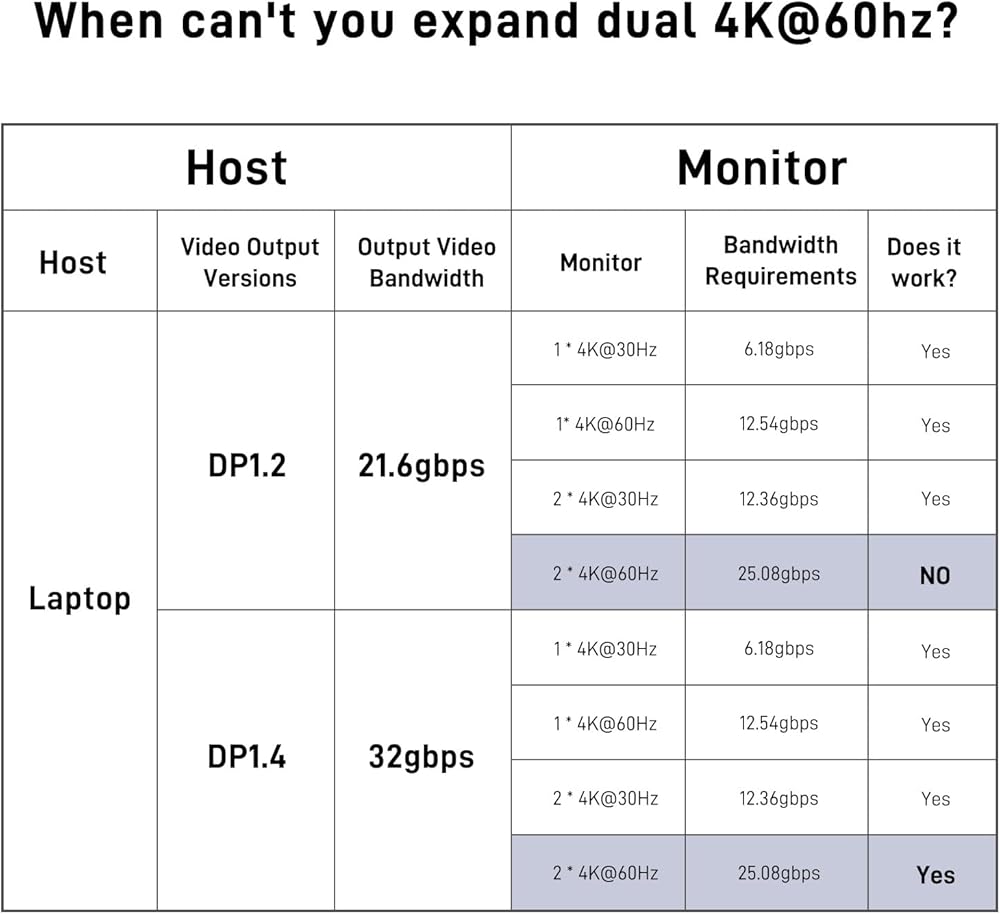 دعم شاشة 4K مزدوجة: يدعم المحور المزدوج 4K عند 30-60 هرتز، مثالي لأجهزة الكمبيوتر المحمولة DP1.4 لتمتد إلى شاشات 4K عند 30-60 هرتز المزدوجة (ملاحظة: يدعم MacBook شاشة ممتدة واحدة فقط).