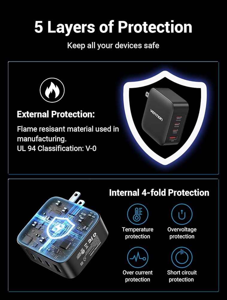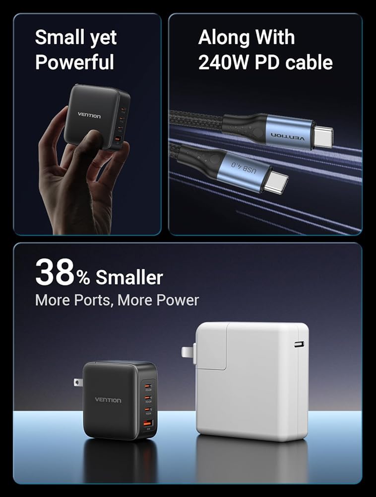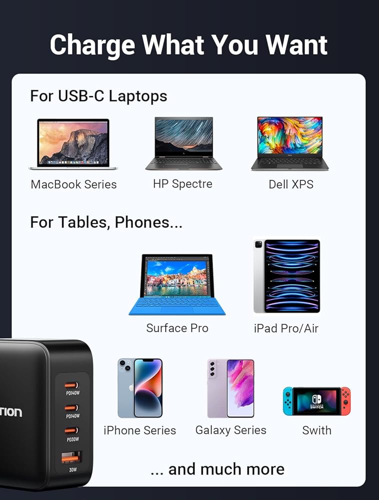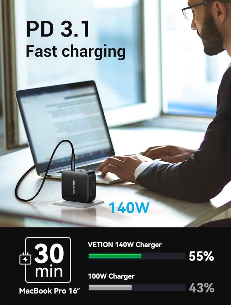 توافق واسع: شاحن VENTION Macbook Pro 140W متوافق مع MacBook Pro 16، 15، 14، 13 بوصة، MacBook Air، HP Spectre/HP Chromebook، iPad Pro، Galaxy S23 Ultra/S22، Switch، Steam Deck، والمزيد؛ يدعم Samsung 45W بروتوكول شحن فائق السرعة 2,0.