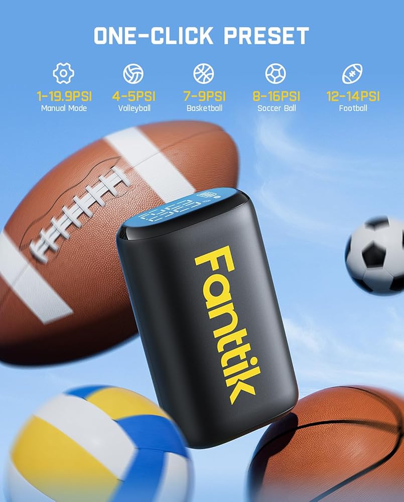 الإعدادات المسبقة بنقرة واحدة: اختر من بين أربعة أوضاع محددة مسبقًا (كرة السلة وكرة القدم وكرة القدم والكرة الطائرة)، اضغط على زر التشغيل، واترك المضخة تصل تلقائيًا إلى الضغط المحدد مسبقًا، مما يضمن النفخ الأمثل؛ لا مزيد من التخمين أو القلق بشأن التضخم الزائد - فهو يتوقف تلقائيًا، مما يضمن السلامة القصوى