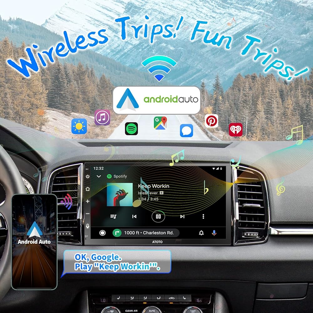 يوفر راديو السيارة 2-DIN F7 WE أيضًا نظام Android Auto السلكي واللاسلكي. تخطط خرائط Google للمسار المناسب لك، بينما يقترح YouTube Music الأنواع الموسيقية المفضلة لديك. باختصار، دع Android Auto يتعامل مع التوتر بينما تسترخي وتركز على عجلة القيادة! إذا كنت ترغب في استخدام التنقل في Android Auto أثناء الاستماع إلى راديو FM/AM أو موسيقى USB، فمن المستحسن بشدة شراء سلسلة ATOTO F7 XE.