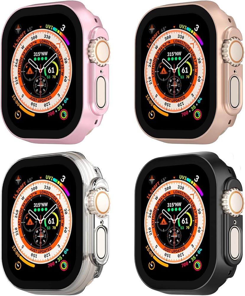 حافظة حماية شاشة Simpeak بأربعة ألوان مقاس 49 مم متوافقة مع ساعة Apple Watch Ultra/Ultra 2، غطاء حماية كامل من الصدمات متوافق مع iWatch Ultra، أسود، شفاف، ذهبي وردي، وردي (49 مم)