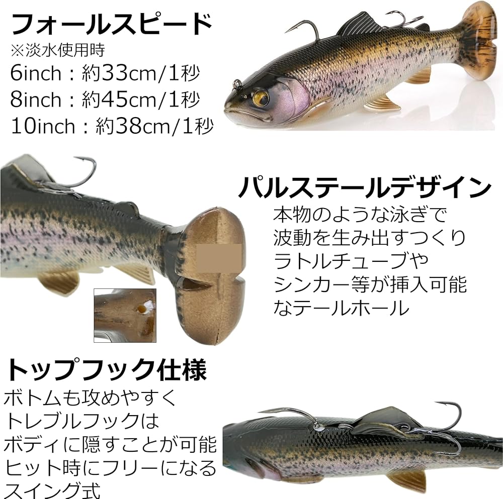 오리지널 4D Pulsetail 송어와 동일한 훌륭한 품질과 물고기를 잡는 능력을 제공하는 Savage Gear 15.2cm(6인치) Pulsetail 송어 RTF Swimbait은 고정된 지그 후크로 낚시를 원하는 낚시꾼을 위한 상단 후크 구성을 갖추고 있습니다. 획기적인 펄스 테일 디자인이 특징이며, 꼬리가 꽉 끼는 동작으로 느리고, 중간 및 고속에서도 낚시를 할 수 있는 미묘하고 매우 사실적인 액션을 제공합니다. 혁신적인 슬롯은 꼬리 상단에 통합되어 낚시꾼이 향기나 딸랑이로 수영복을 수정하여 확신하지 못하는 트로피 런커가 송어를 맛볼 수 있도록 유혹할 수 있습니다. 새비지 기어는 꼬리에 있는 것과 같은 디테일을 신체의 나머지 부분에 적용했습니다. 믿을 수 없을 정도로 실물과 같은 신체 형태와 색상으로 호수 속 베이스는 무시할 수 없습니다.