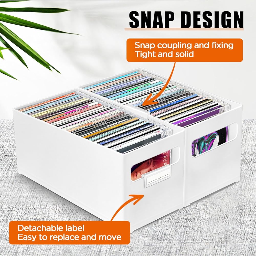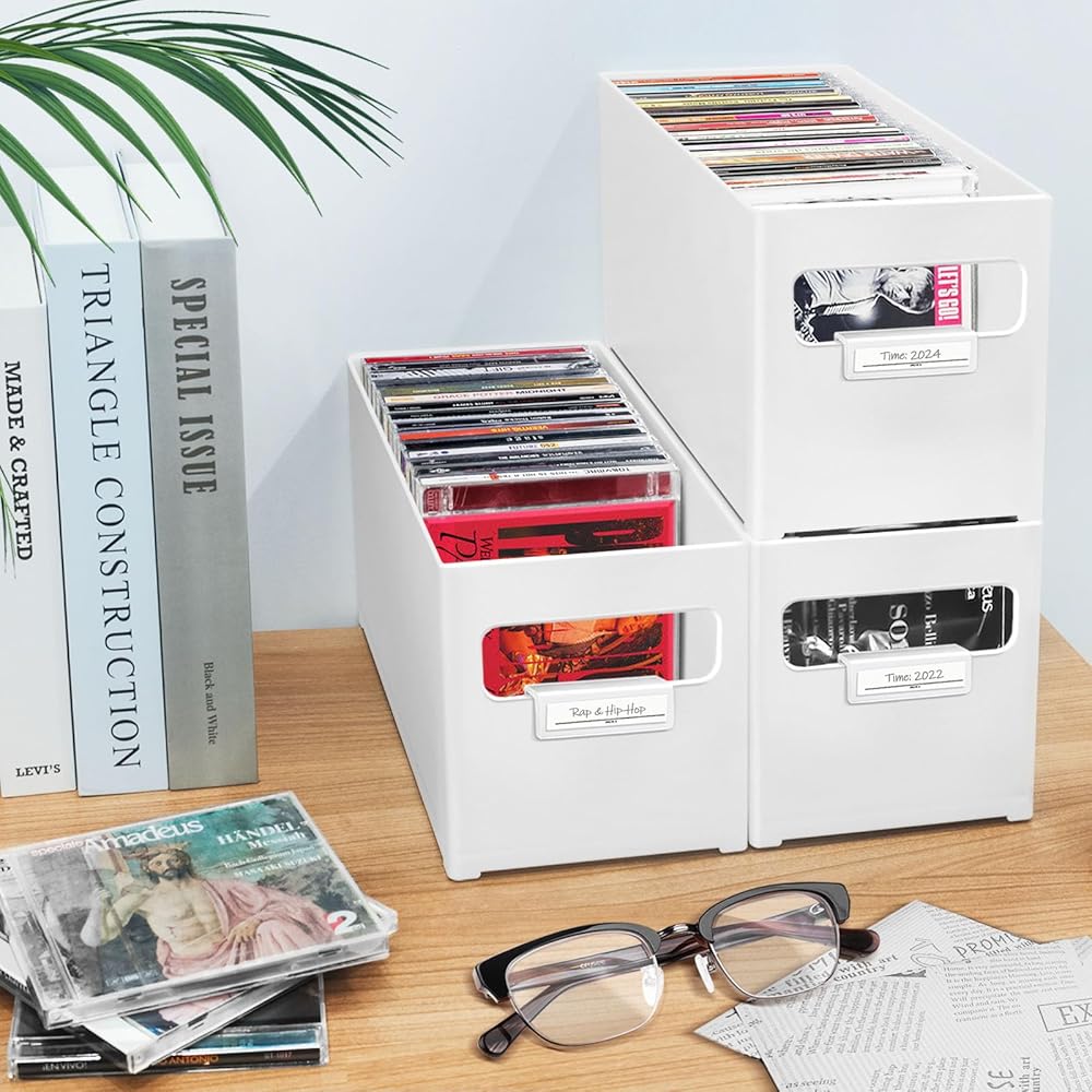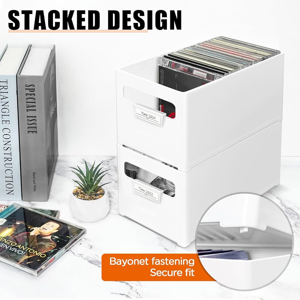 منظم الأقراص المضغوطة القابل للتكديس: تصميم قابل للتكديس، يمكن تكديس صناديق متعددة فوق بعضها البعض دون سحق الأقراص المضغوطة. الاستخدام الفعال للمساحة الرأسية، تحرير الرف الثمين أو مساحة المكتب. رائعة لنمو المجموعات.