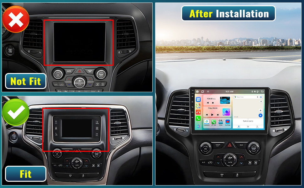 【CarPlay اللاسلكي وAndroid Auto & Mirror Link】مشغل الوسائط المتعددة للسيارة Android لسيارة Jeep Grand Cherokee 2014 مع carPlay اللاسلكي وAndroid Auto، يمكنك التحكم الصوتي Siri/Go-ogle عبر اتصال Bluetooth/WiFi للوصول إلى استريو السيارة واستخدام الخريطة، الاتصال وتشغيل الموسيقى واستقبال الرسائل وما إلى ذلك. وحدة قياس الصوت الرقمية 9 بوصة لسيارة جيب جراند شيروكي مع وصلة مرآة، وعرض المحتوى من هاتفك بشكل متزامن (ملاحظة: أحدث دعم iOS 17.7/ Android 13، جزئي سامسونج)