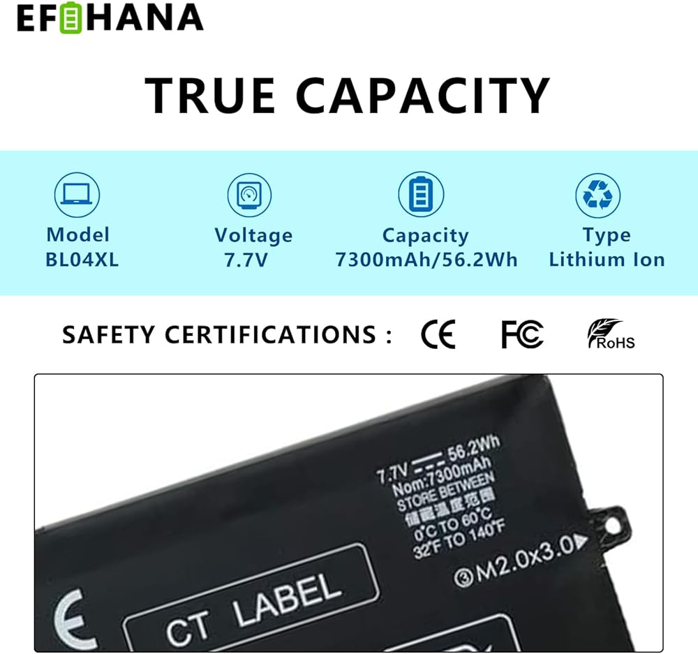 • 🔋【Specifications】Model: BL04XL // Battery type: Li-ion // Color: Black // Voltage: 7.7V // Capacity: 56.2Wh/7300mAh. (We only use grade A battery cells that provide up to 500 recharge cycles over the life of the battery. Come with screwdrivers.)