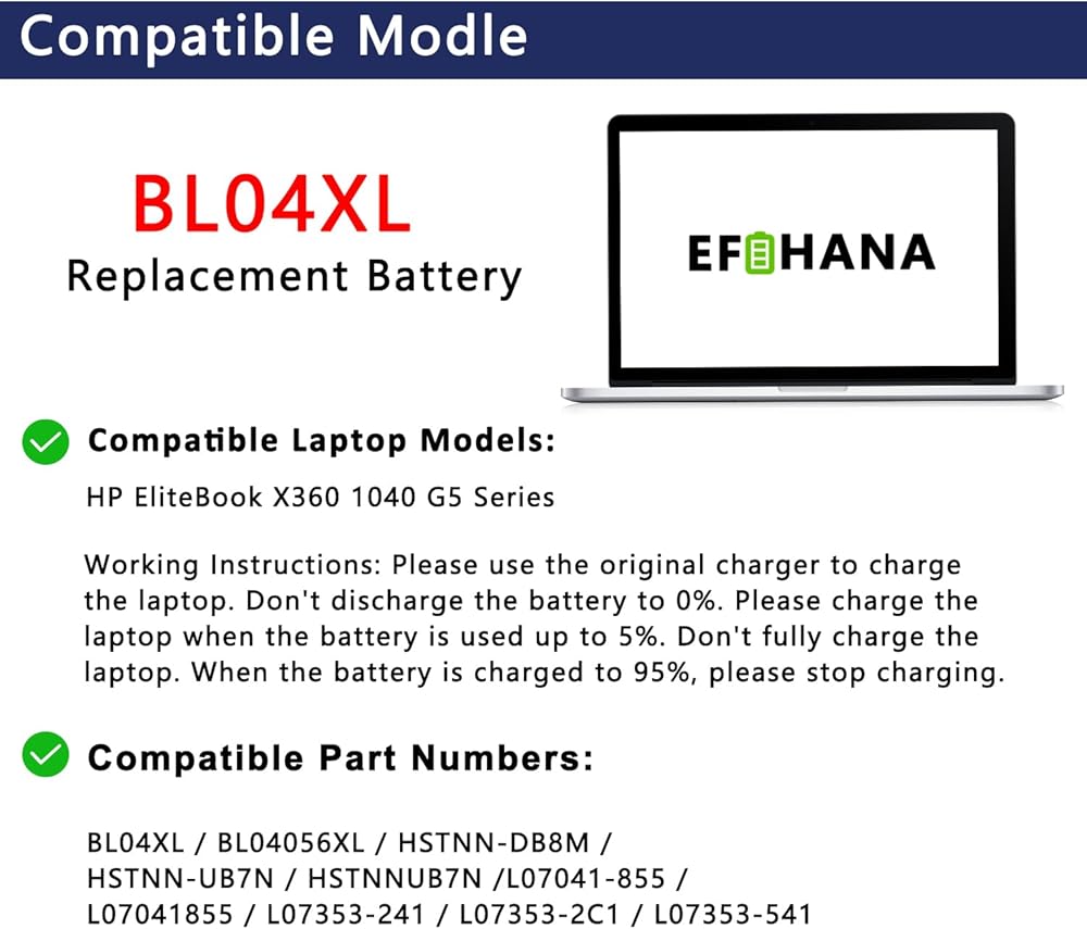 • 😎【Security】All EFOHANA products are certified by UL / CE / FCC / RoHS for safety. We're so confident in the performance of our replacement laptop batteries, strict guidelines for compatibility, strict quality control standards and standards compliance for environment safety. (including short circuit, overheat, and overload protections.)