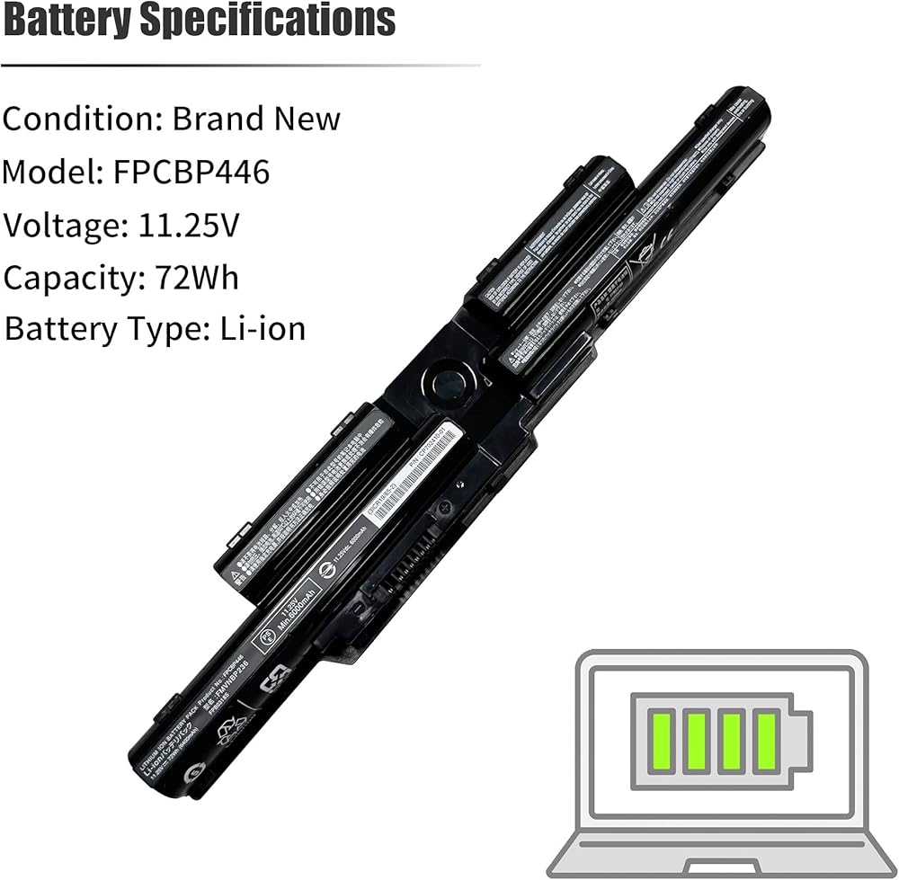 【المواصفات الفنية】نوع الجهاز: بطارية الكمبيوتر المحمول، نوع البطارية: ليثيوم أيون 6 خلايا، الجهد: 11.25 فولت، السعة: 6400 مللي أمبير/72 وات في الساعة، الحالة: جديد تمامًا، ضمان الشركة المصنعة: سنة واحدة