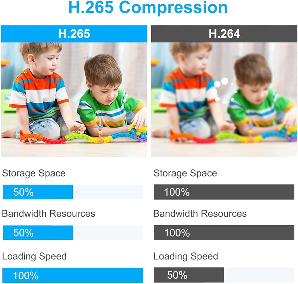 تسجيل NVR على مدار الساعة طوال أيام الأسبوع مع الصوت وتقنية الضغط المتقدمة: يمكن لكاميرات Anpviz IP تسجيل الفيديو بصوت على مدار الساعة طوال أيام الأسبوع، وبث لقطات عالية الدقة إلى مسجلات فيديو شبكة Anpviz PoE في الوقت الفعلي. تتيح لك تقنية الضغط H.265 المتقدمة توفير مساحة التخزين، وبالتالي إطالة وقت التسجيل. تعمل تقنية H.265 على ضغط الفيديو الخاص بك دون التضحية بجودة الفيديو، مما يعزز سهولة وأمان وظائف البحث والتشغيل والنسخ الاحتياطي.