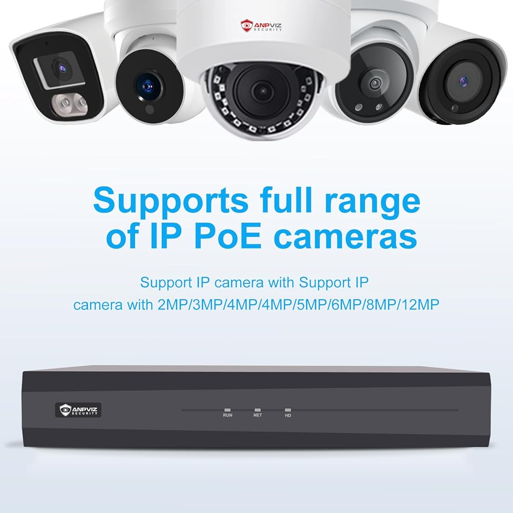 NVR متوافق مع معظم كاميرات POE: يمكن توصيل مسجل فيديو الشبكة بمعظم كاميرات IP / كاميرات POE الاحترافية في السوق، ويدعم 12MP/8MP/6MP/5MP/4MP/3MP/1080P لمنفذ HDMI ومنفذ VGA، ويعمل بشكل مثالي مع جميع كاميرات سلسلة U من Anpviz.