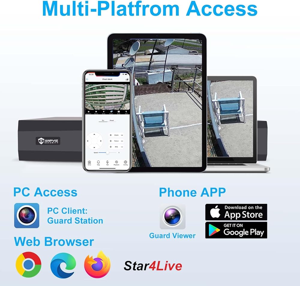 الوصول المحلي والبعيد: عرض في أي وقت وفي أي مكان، والوصول والتحكم متعدد المنصات. تطبيق الهاتف - عارض الحراسة / الوصول إلى الكمبيوتر الشخصي - محطة الحراسة / متصفح الويب، يمكن للجميع الوصول فورًا إلى العرض والتشغيل في الوقت الفعلي. قم بتوصيل وإدارة جميع كاميرات IP الموجودة على الشبكة مباشرةً عبر كابل Ethernet، مما يجعل نظام أمان المنزل سهلاً ومريحًا للغاية. لا توجد رسوم شهرية، أو مرافقة لك.