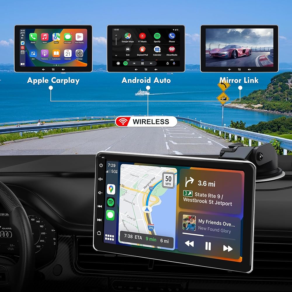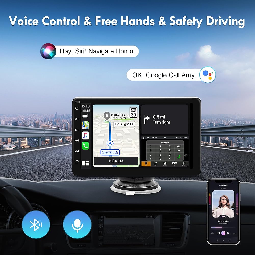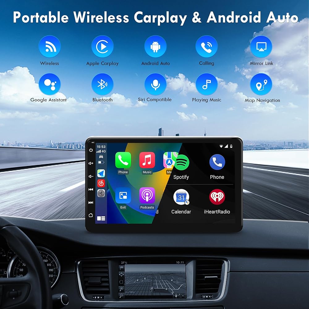 ✔【شاشة تشغيل لاسلكية وتشغيل السيارة السلكية/Android Auto】ستيريو السيارة اللاسلكي المحمول الذي يعمل باللمس متوافق مع Apple carplay ووظيفة android التلقائية. يمكنك التعامل لاسلكيًا مع التنقل والرسائل والمكالمات الهاتفية والموسيقى والبريد الإلكتروني والإشعارات والمزيد. يمكنك أيضًا استخدام استريو السيارة مع apple carplay لتوصيل مساعد Google أو Siri بجهازك للتحكم في المكالمات الهاتفية، ونظام تحديد المواقع العالمي (GPS) للسيارة، وتشغيل الموسيقى، كل ذلك حتى تتمكن من التركيز على الطريق، وإبقاء يديك حرتين، والقيادة بأمان تام. !