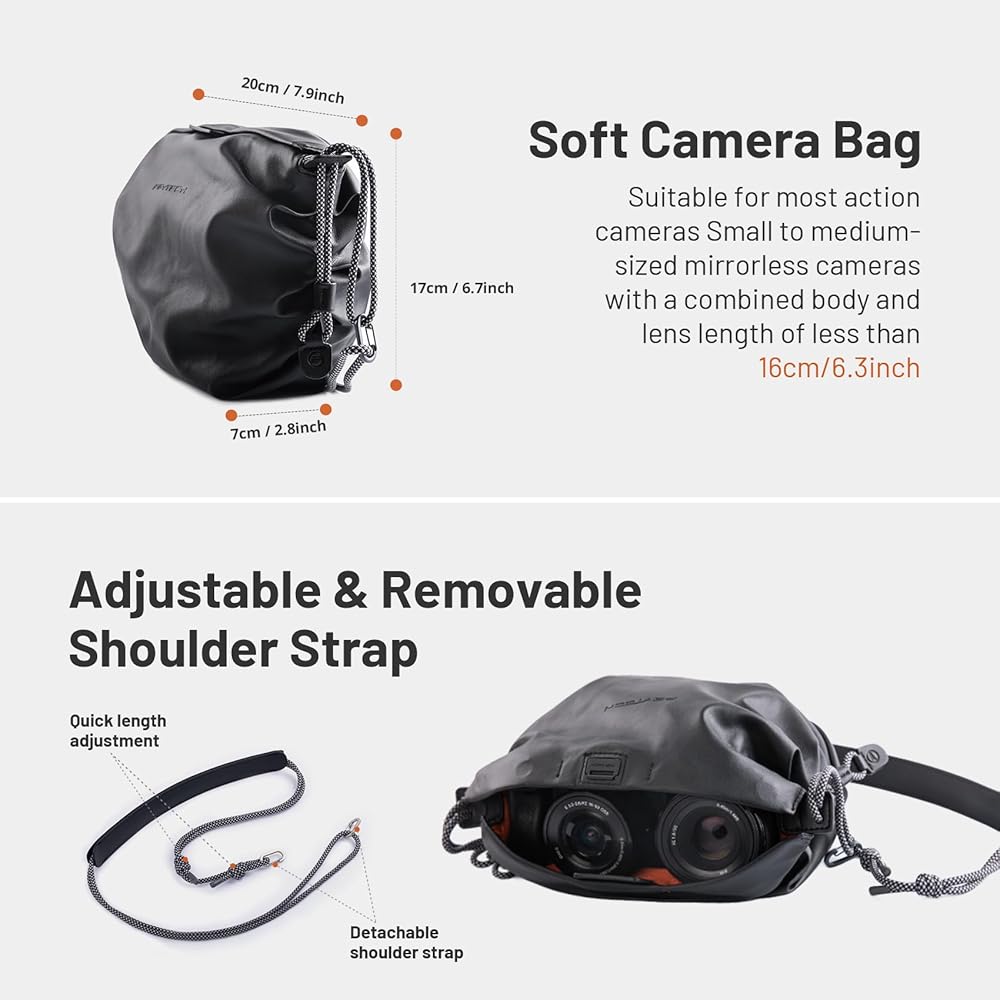 التوافق: 8.7 بوصة × 10.2 بوصة × 3.1 بوصة، يمكن لحقيبة الكاميرا حمل كاميرات صغيرة أو متوسطة الحجم بدون مرايا مع جسم مدمج وطول عدسة أقل من 6.3 بوصة، متوافقة مع XT5/R50/Nikon ZF/Sony A7 (ملاحظة: لا يُنصح باستخدام كاميرات ذات غالق إلكتروني مثل ZV-1)؛ مناسبة لكاميرات الحركة (OSMO Action/Pocket/Insta360/Gopro، إلخ.)