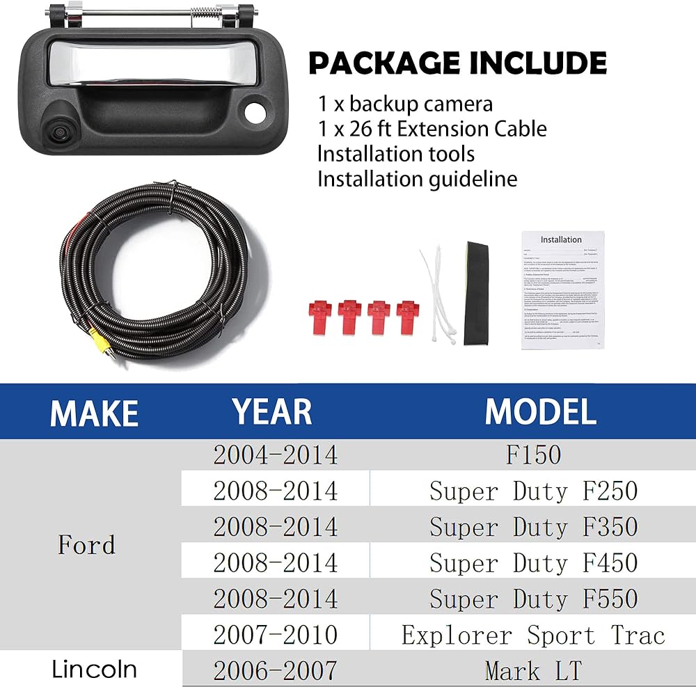 تركيب السيارة: كاميرا احتياطية بمقبض الباب الخلفي تعمل مع سلسلة Ford: 2004-2014 F150، 2008-2016 Super Duty F250؛ سوبر ديوتي F350 / سوبر ديوتي F450؛ سوبر ديوتي F550، 2007-2010 إكسبلورر سبورت تراك؛ ل 2006-2008 لينكولن مارك LT