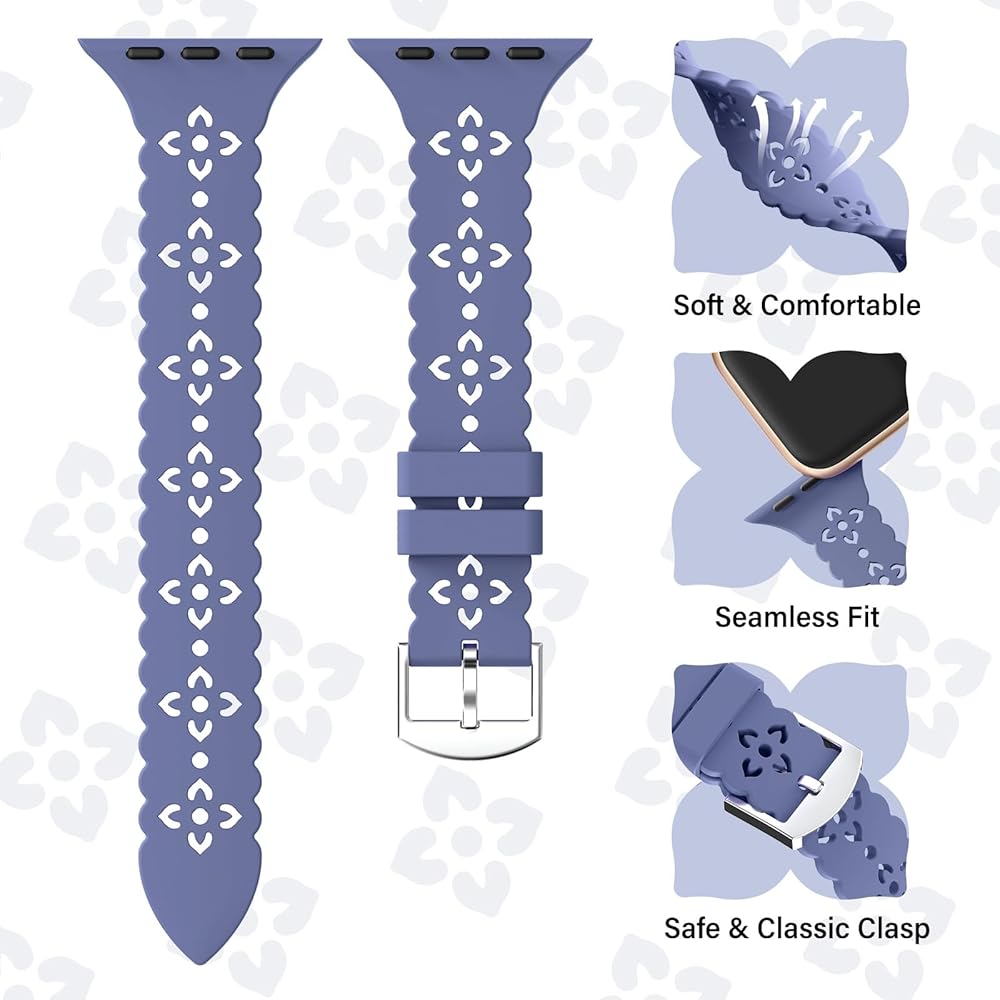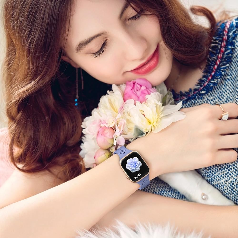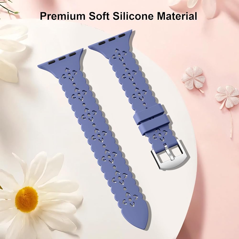 【توافق واسع】أساور سيليكون من الدانتيل المزخرف بالزهور متوافقة مع سوار ساعة Apple 38 مم 40 مم 41 مم 42 مم 44 مم 45 مم 46 مم 49 مم، لسلسلة iWatch 10 (42 مم)، السلسلة 9/8/7 (41 مم)، السلسلة 6/5/4/SE/SE 2 (40 ملم)، والسلسلة 3/2/1 (38 ملم). ما عليك سوى التحقق من النموذج الموجود على الجزء الخلفي من ساعتك لتحديد المقاس المثالي. تتميز أحزمة iwatch للنساء بأنها متعددة الاستخدامات وموثوقة، وقد تم تصميمها لتتناسب مع مجموعة واسعة من موديلات Apple Watch.
