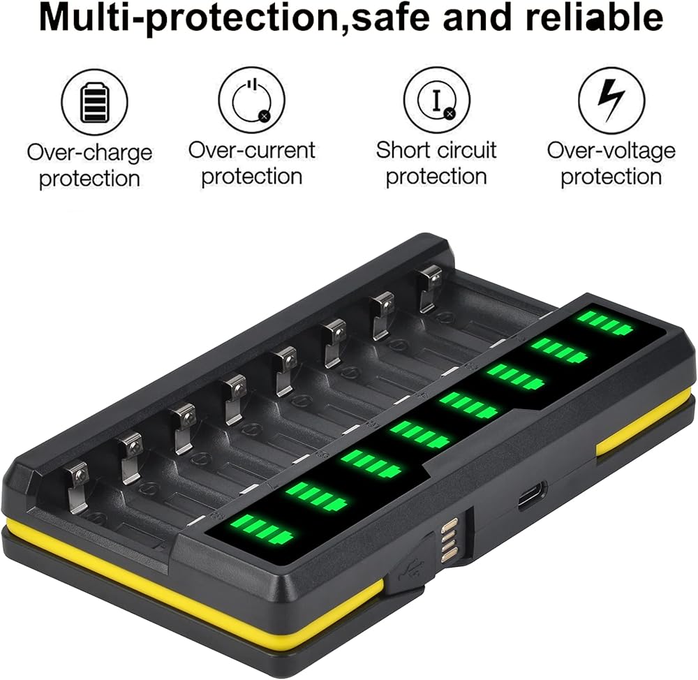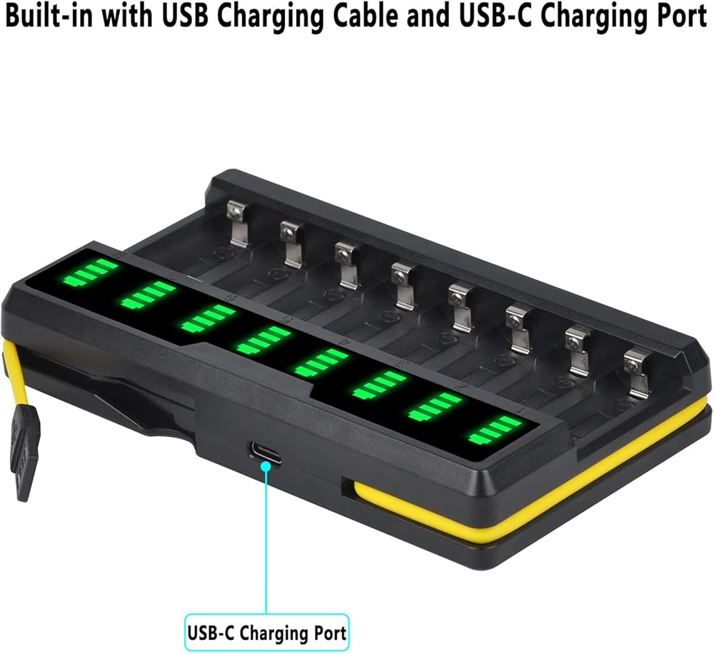 • Smart LED Charger:8 bays independent charger design is convenient to charge batteries simultaneously and independently. LED Display shows real-time comprehensive and accurate information on battery charge status.