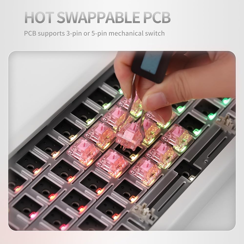 【مصابيح LED قابلة للتبديل السريع والمواجهة للجنوب 】 تم تجهيز EPOMAKER EK68 VIA بثنائي الفينيل متعدد الكلور القابل للتبديل السريع لضمان الاستبدال المجاني أو تغيير المفاتيح. لا تحتاج إلى لحامه. وهو متوافق مع معظم المفاتيح الميكانيكية ذات 3 دبابيس و5 دبابيس، مثل Cherry وGateron وOtemu وKailh ومفاتيح MX الأخرى ومستنسخاتها. تم تصميم RGB LED المواجه للجنوب لإضاءة الإضاءة الخلفية للوحة المفاتيح بشكل أفضل من زاوية الكاتب. كما أنه يتجنب التداخل عندما يقوم المستخدم بتثبيت أغطية مفاتيح ملف تعريف الكرز الشائعة