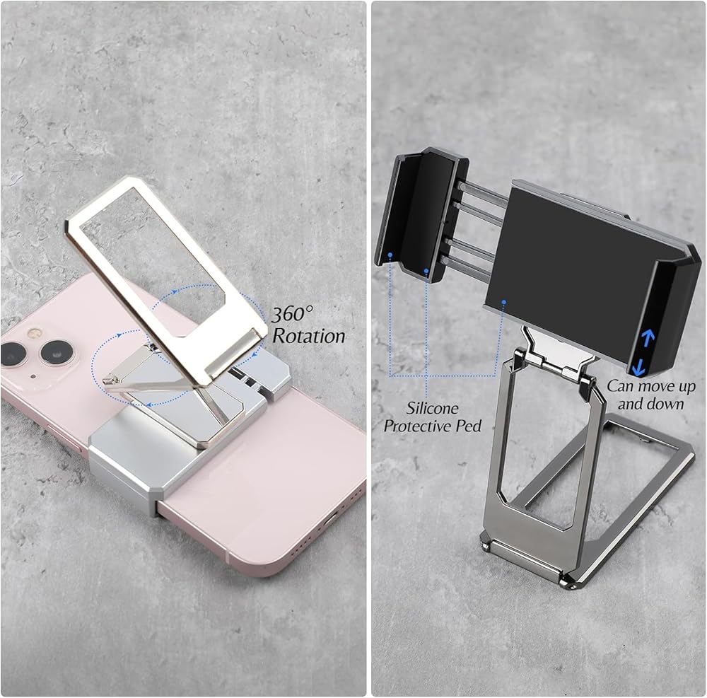 【High-Quality Materials】360 Folding Stand with Back Clip is made of weighted high-quality metal. The groove design of the base paired with a strong adjustable rod forms a sturdy triangular structure that can be stably placed on top, even with a thick case