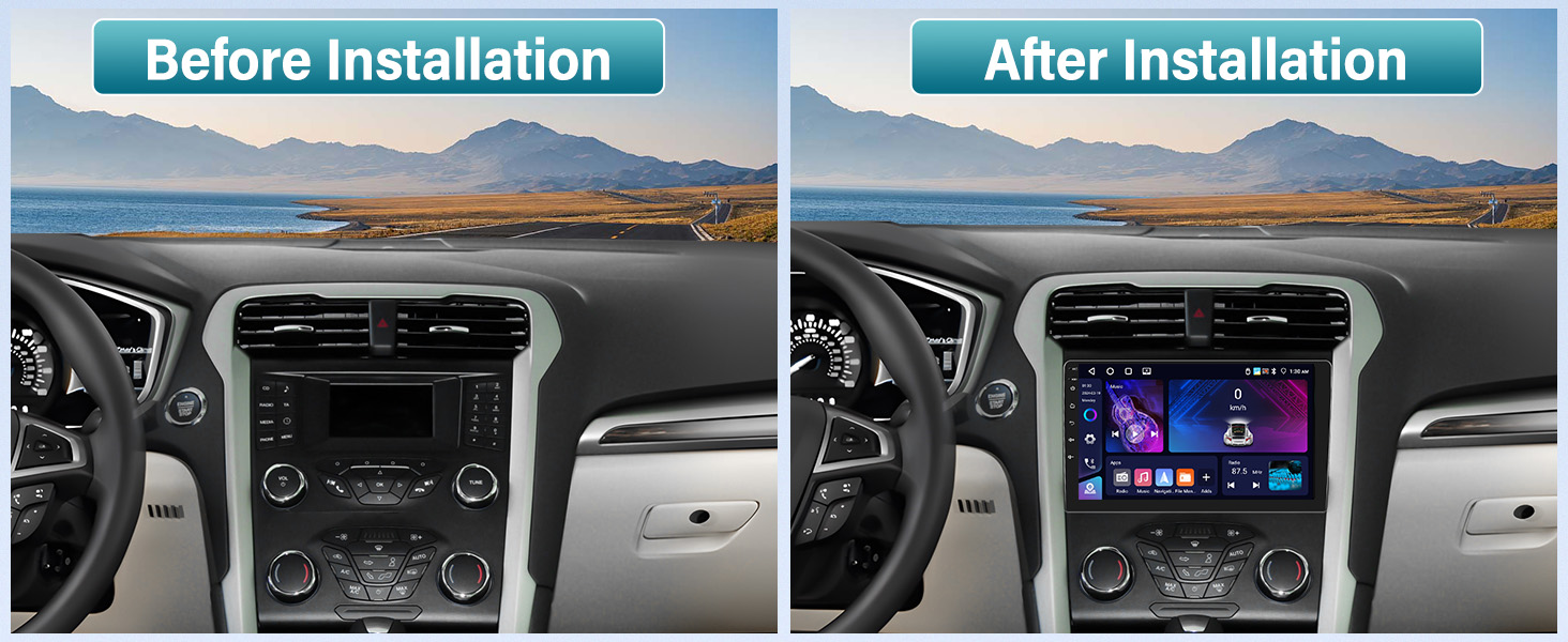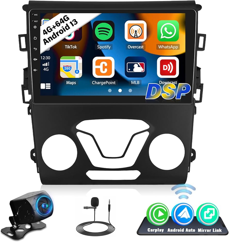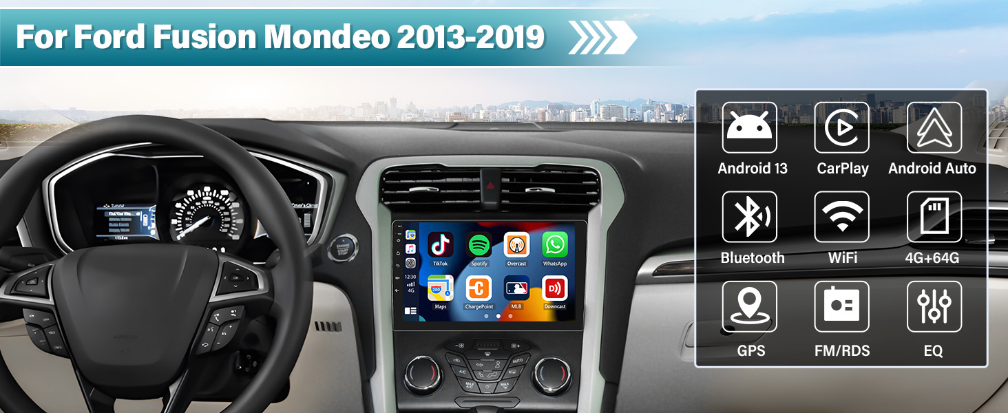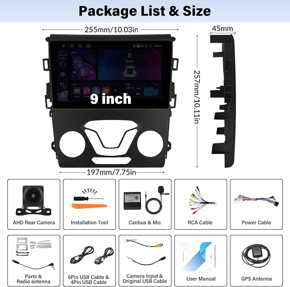 【موديلات السيارات المتوافقة وAndroid 13، 4G+64G】راديو ستيريو للسيارة Android 13 لسيارة Ford Fusion Mondeo 2013-2019، وحدة رأس التوصيل والتشغيل. تمت ترقيته إلى أحدث نظام تشغيل 13 مطورًا، رباعي النواة، وذاكرة وصول عشوائي كبيرة بسعة 4 جيجابايت، وتخزين ذاكرة ROM بسعة 64 جيجابايت. هذا الراديو الذي يعمل باللمس مقاس 9 بوصة لسيارة Ford Fusion Mondeo 2013-2019 أسرع وقوي