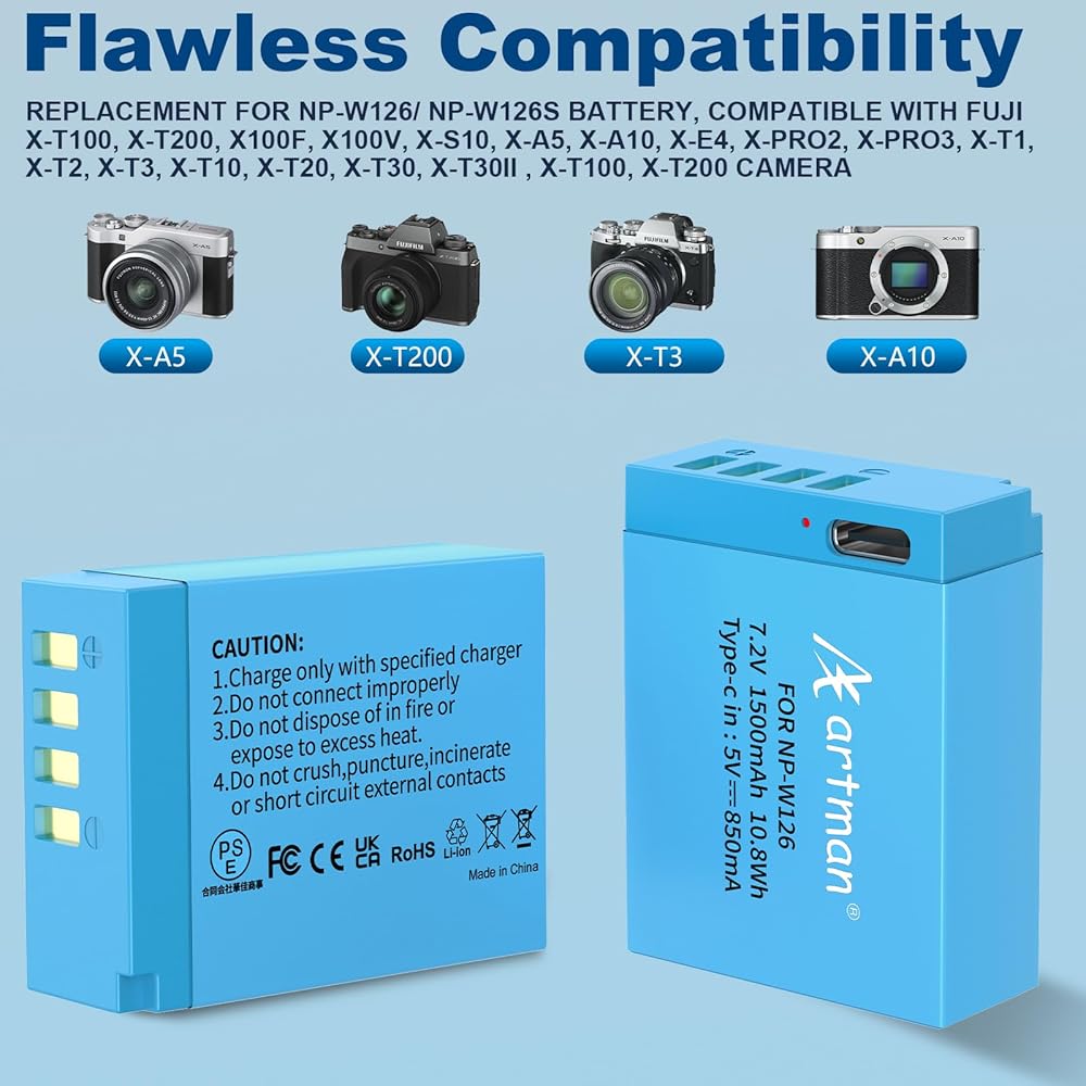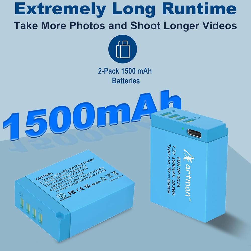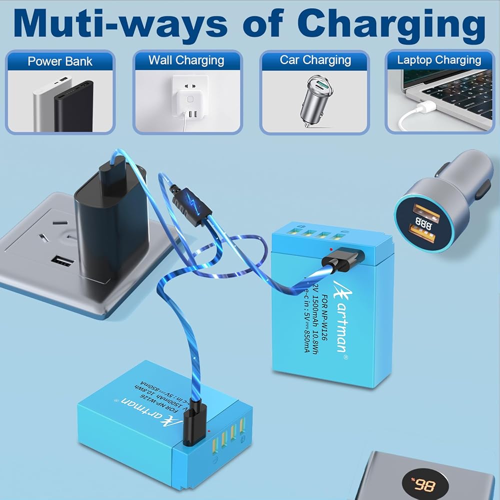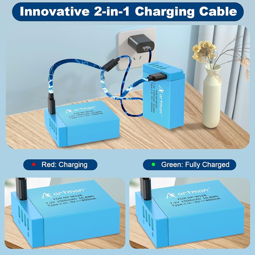 شحن سريع USB-C: تعمل بطارية منفذ الشحن المباشر Artman NP-W126/ NP-W126S على تحسين راحة الشحن بشكل كبير. يوفر لك كابل 2 في 1 من النوع C الراحة، حيث يمكنك شحن بطاريتين np-w126 في أي وقت وفي أي مكان.