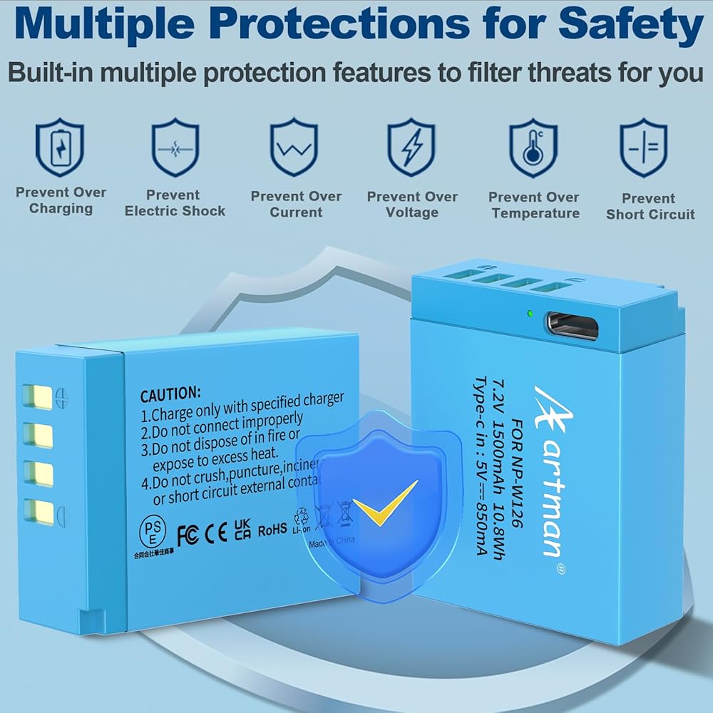 آمنة وموثوقة لبطارية X-T30: تحتوي بطارية Artman NP-W126 على شرائح ذكية مدمجة، توفر الشحن الزائد، والدائرة القصيرة، ودرجة الحرارة العالية، والتيار الزائد والجهد الزائد، وتعتمد بنية مقاومة للحريق عالية الجودة لتجنب مشاكل السلامة بشكل فعال
