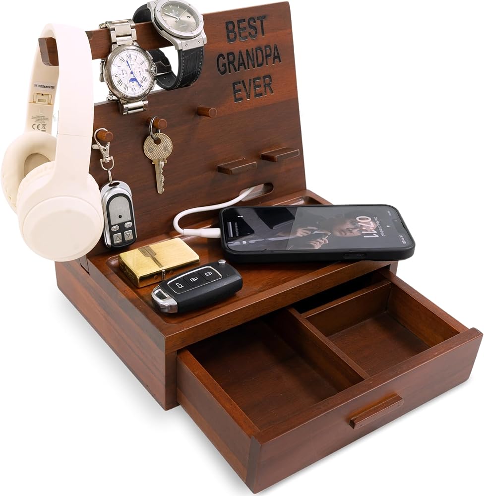 هدايا الجد الرائعة: قم بإنشاء المكان المثالي لجميع الأشياء الخاصة بك، بدلاً من نثرها في كل مكان. امنح مساحتك مساحة للتنفس باستخدام قاعدة الإرساء الخشبية هذه لأجهزتك وساعتك وخواتمك ومحفظتك.