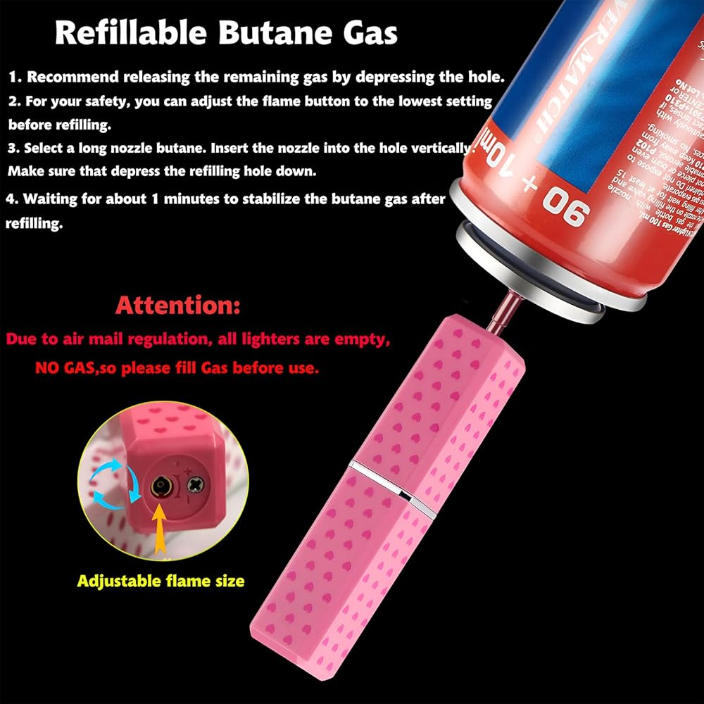 【سهولة إعادة تعبئة البوتان】استخدام طريقة إعادة تعبئة البوتان المريحة للاستخدام البسيط والسهل. فقط قم بقلب ولاعة الترحيب وأدخل فوهة البوتان لبضع ثوان، ثم يمكنك الحصول على ولاعة مليئة بالغاز. يمكنك الذهاب إلى السوبر ماركت أو المتجر الصغير لشراء غاز البوتان القابل للنفخ للاستخدام.