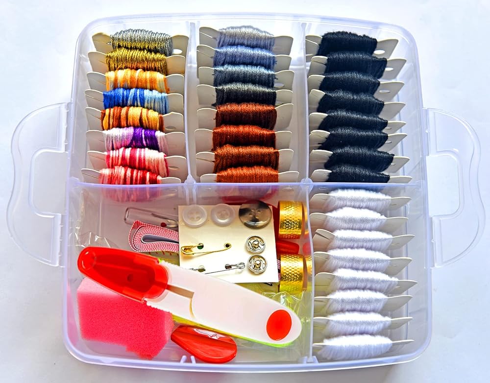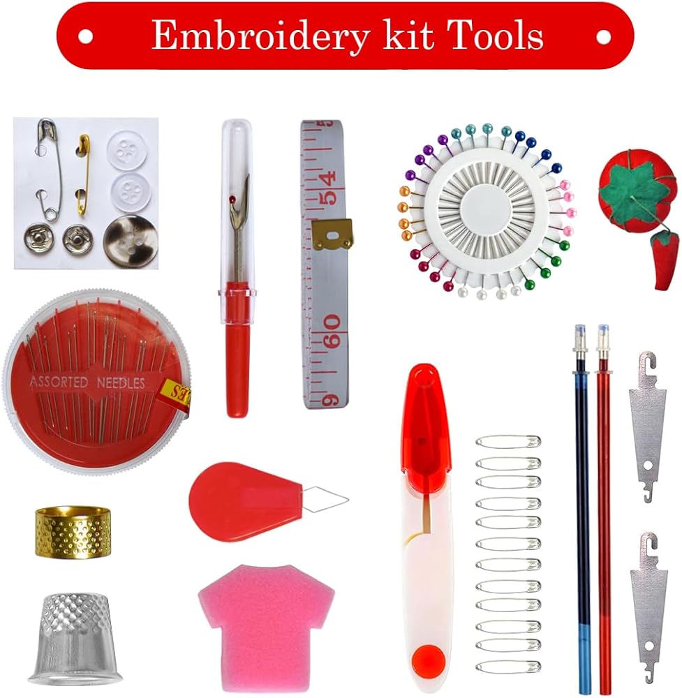 يمكن بدء مشاريع الغرز المتقاطعة بسهولة باستخدام أداة مجموعة التطريز: 1 وسادة دبوس PCC، 2 إبر خياطة معدنية ذهبية، 2 خيط بلاستيكي، 1 مقص. 1 × ممزق درزات ملونة، 1 قطعة شريط (60 بوصة)، مجموعة أزرار، 1 حقيبة تخزين شفافة مكونة من طبقتين