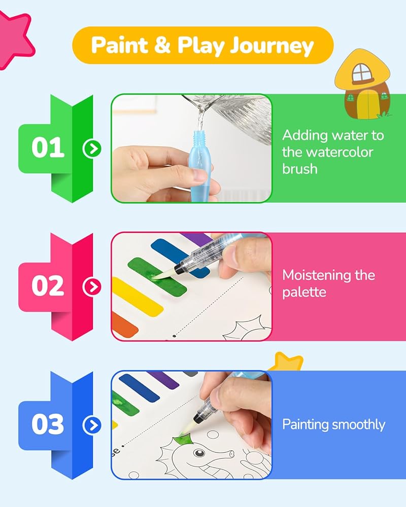 مجموعة متنوعة من الفرش، تحكم سهل: تحتوي كل مجموعة ألوان مائية للأطفال على 3 فرش مياه و3 فرش طلاء. مصممة للأيدي الصغيرة، تضمن هذه المجموعة أن يتمكن طفلك من الرسم بسهولة والاستمتاع بالعملية الإبداعية، حتى عند مشاركتها مع الأصدقاء.