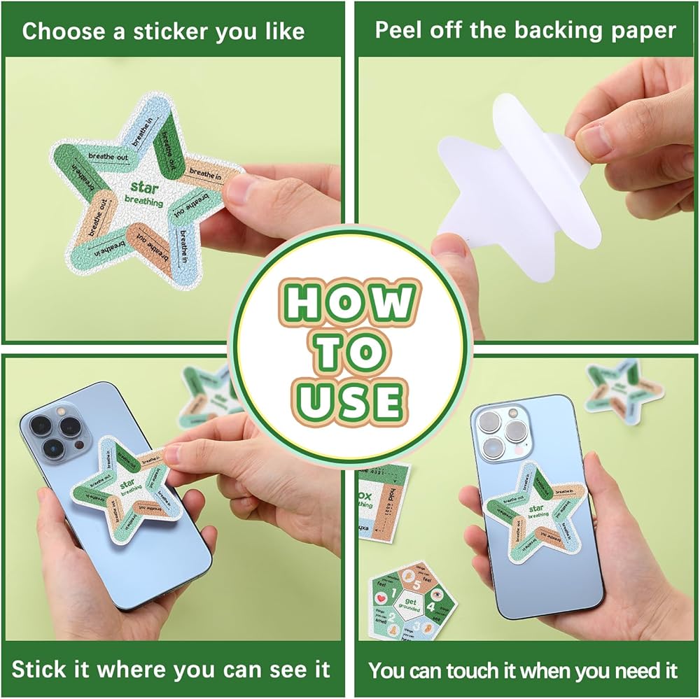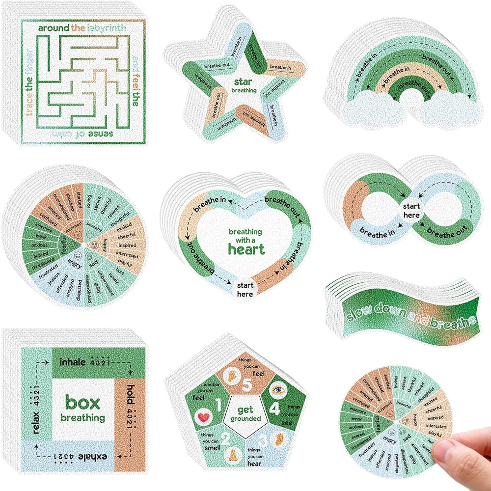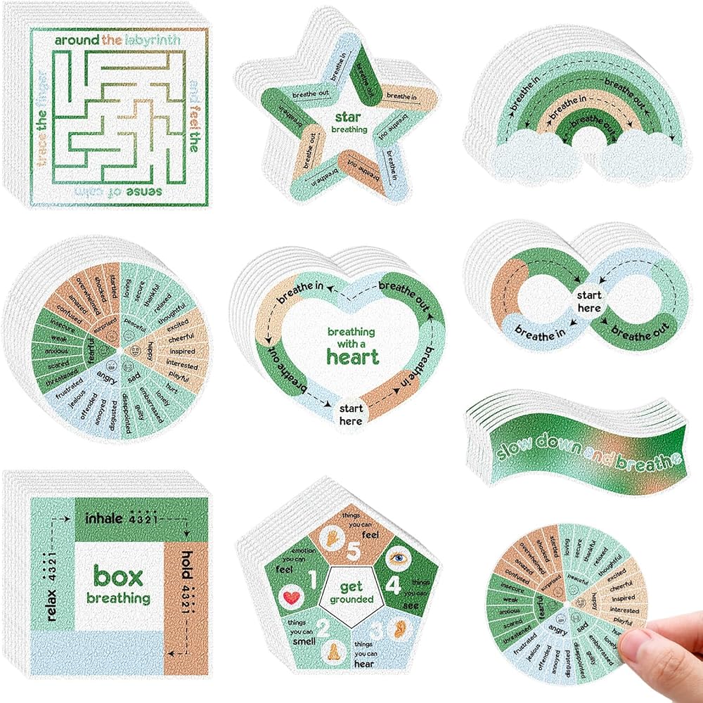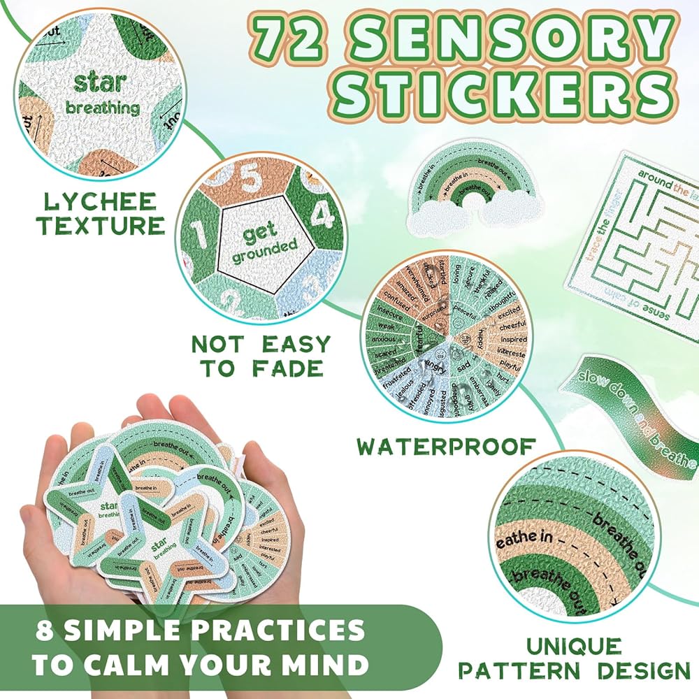 مجموعة متنوعة من الممارسات: مع 9 ممارسات مختلفة للاختيار من بينها، توفر مجموعة الملصقات الحسية مجموعة واسعة من الخيارات، بما في ذلك متاهة الأصابع، والتأريض، وتنفس النجوم، وعجلة المشاعر، والإبطاء والتنفس، وتنفس القلب، وتنفس الصندوق، والشكل الثامن. التنفس وتنفس قوس قزح