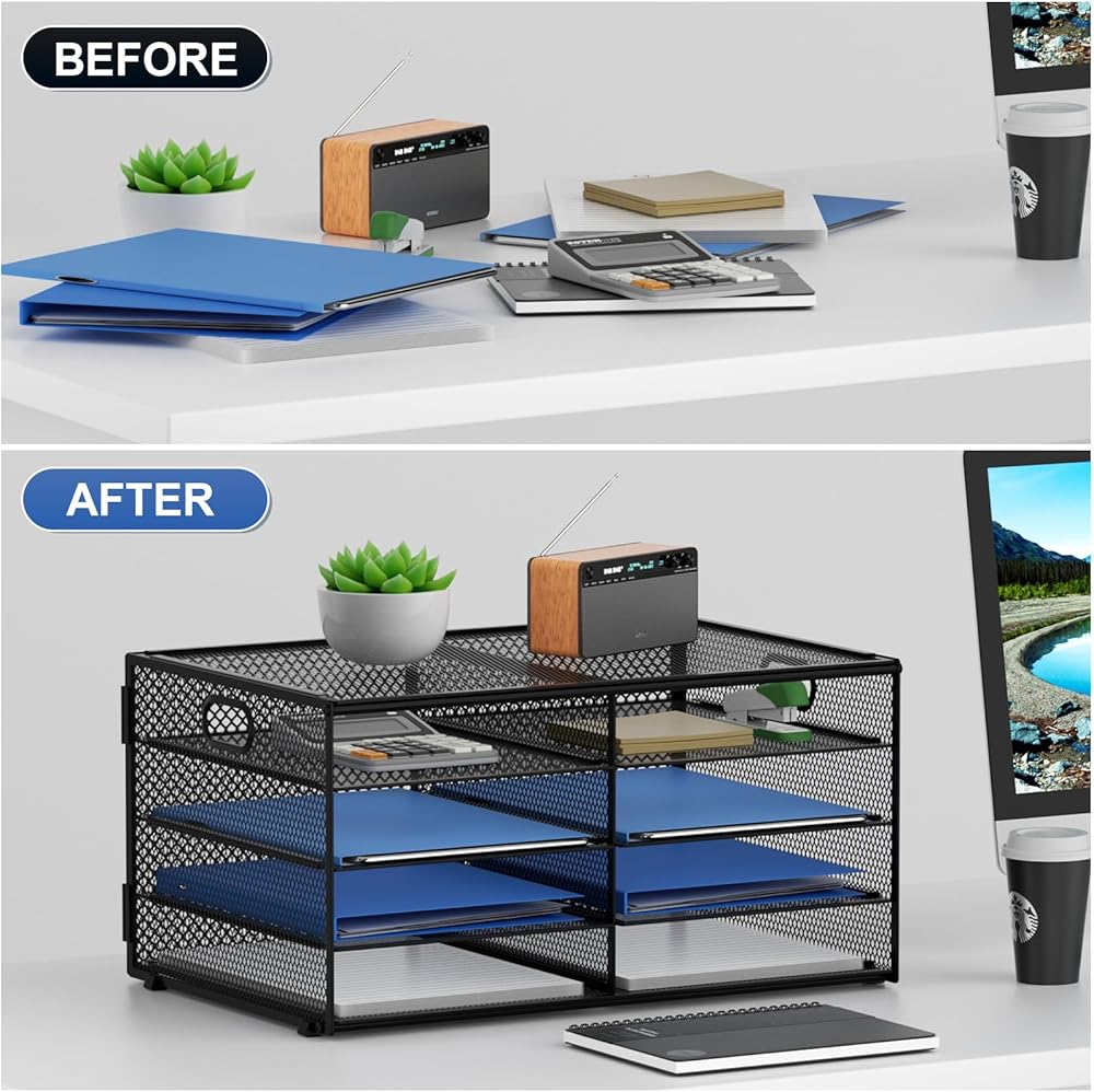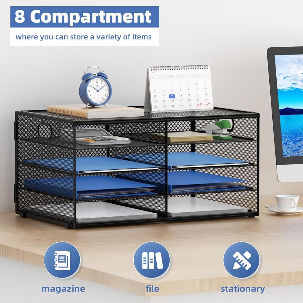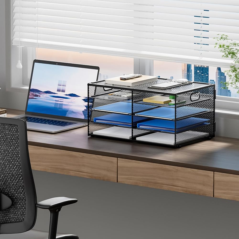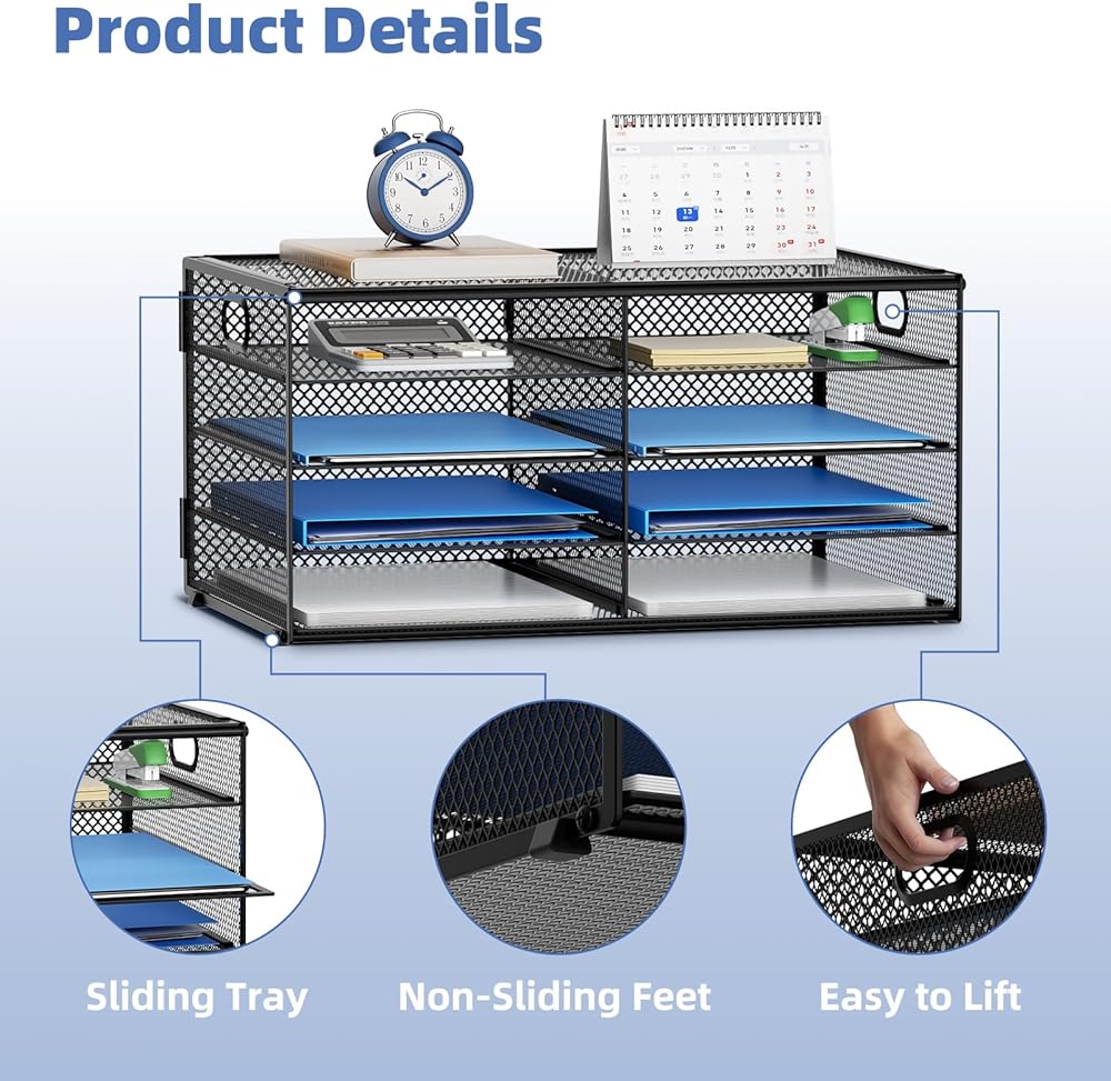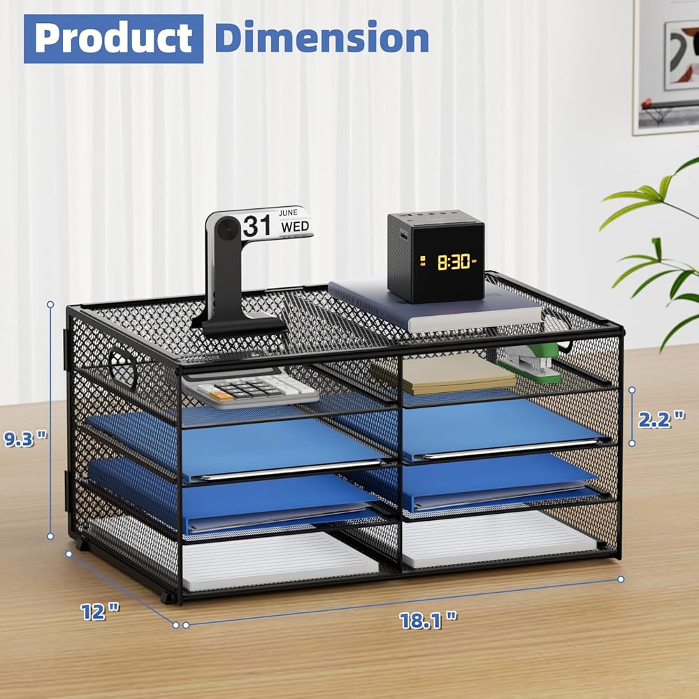 【مادة ممتازة】تنظيم المكتب مصنوع من شبكة معدنية خفيفة الوزن ومتينة، معززة بإطار فولاذي صلب، مما يضمن قوة طويلة الأمد وأداء موثوق.