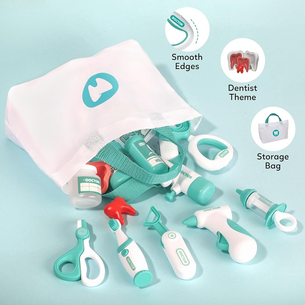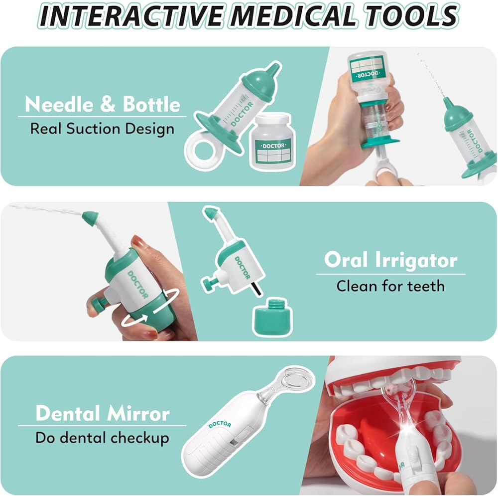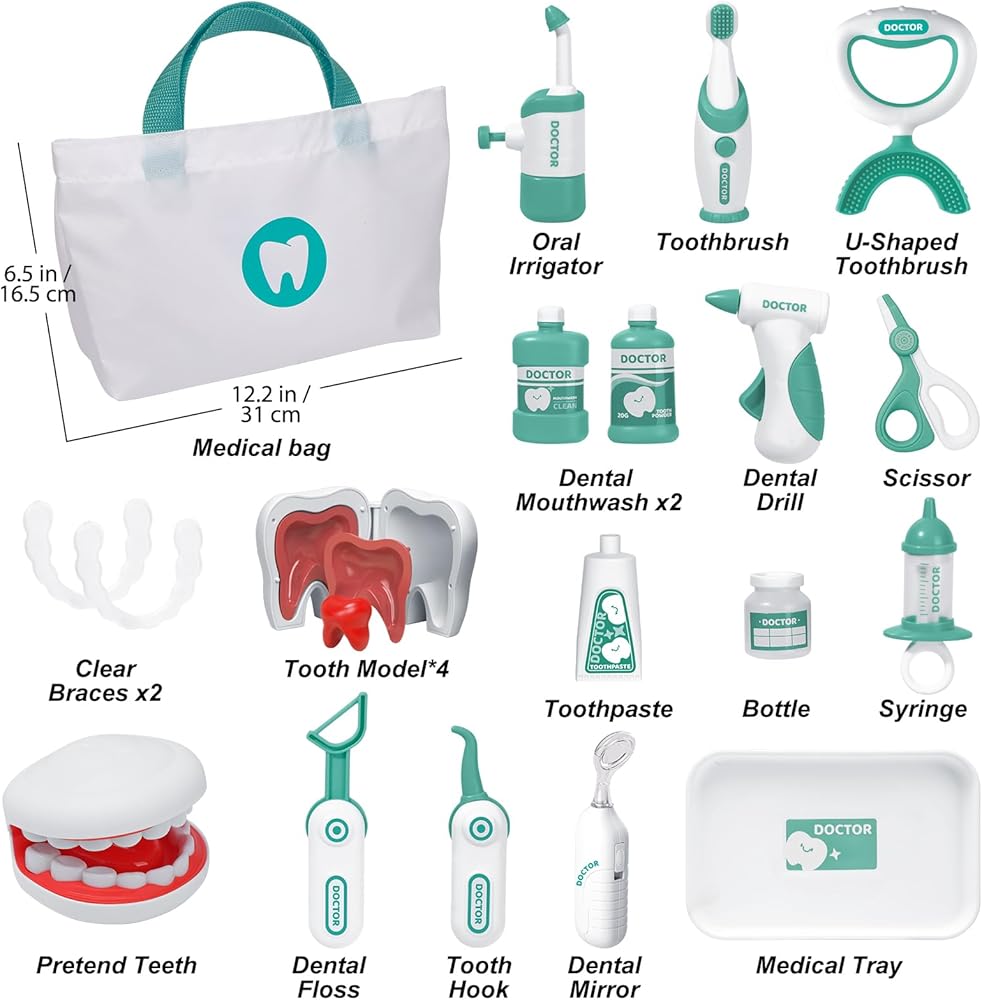 ملحقات مختلفة للعب الأدوار: تشتمل ألعاب الأسنان لدينا على فرشاة أسنان عادية وعلى شكل حرف U، ومعجون أسنان، وأسنان تظاهرية، وخطاف أسنان، وخيط تنظيف الأسنان، ومثقاب أسنان، ومرآة أسنان، وري الفم، ومقص، وصينية طبية، وأقواس شفافة، وغسول فم الأسنان، ونموذج أسنان. أطقم وزجاجة وحقنة وحقيبة طبية للتخزين تحتوي على جميع الأدوات بشكل أنيق