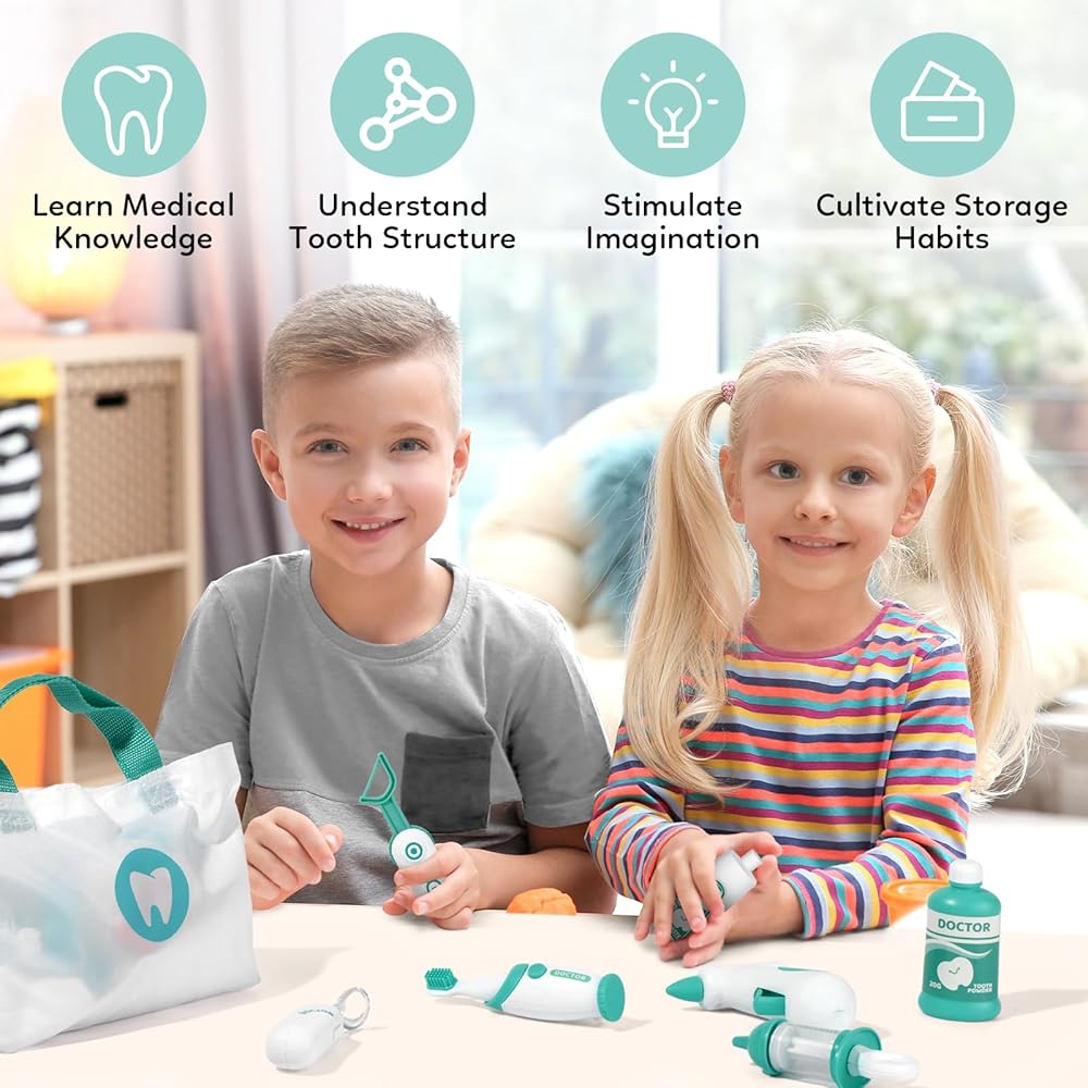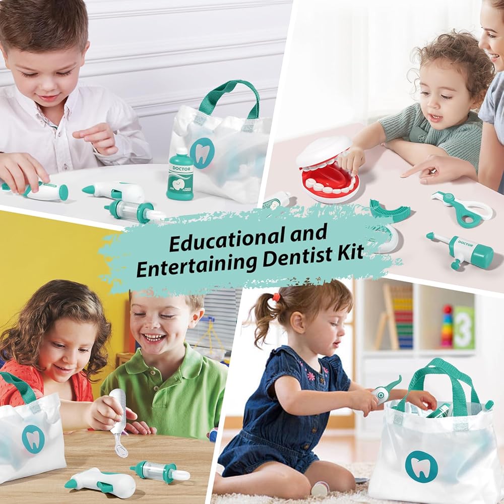 هدية قيمة للغاية للأطفال الصغار: مجموعة لعب طبيب الأسنان الخاصة بنا تمثل هدية عيد ميلاد مدروسة ومثالية، هدية عيد الميلاد للأطفال الصغار من سن 3 إلى 5 سنوات. يمكن للأطفال القيام بدور طبيب الأسنان أو المريض، وإجراء فحوصات روتينية، وإجراء عمليات التنظيف لأفراد أسرهم وأصدقائهم.