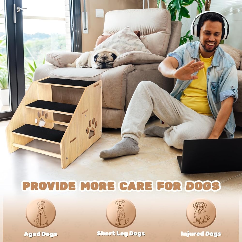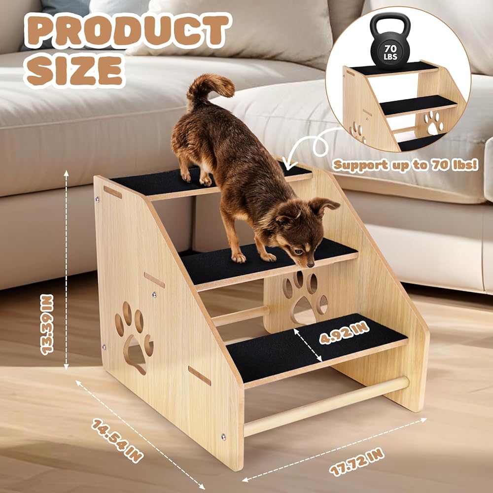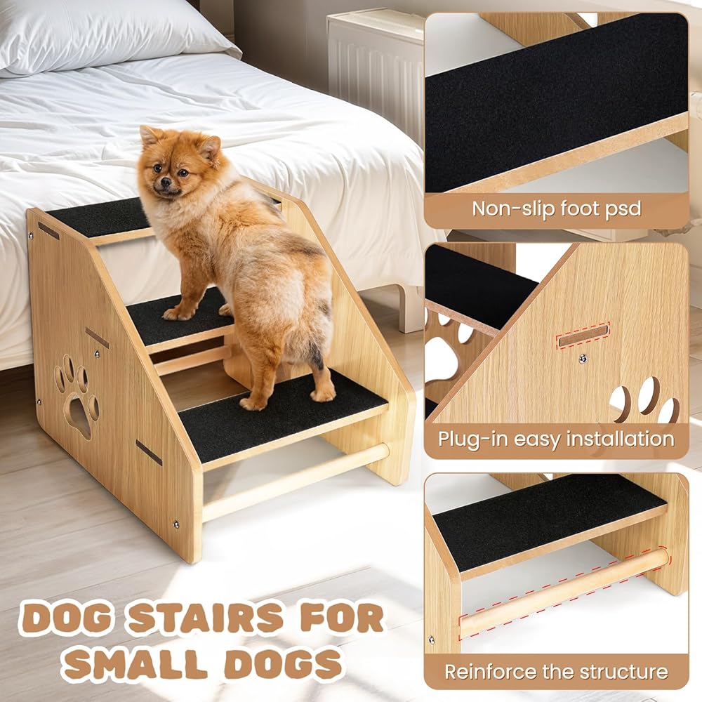 Dog Stairs, Wooden 3-Step Dog Ramp for Small Medium Older Cat Dog, Puppy Essentials Pet Step Ladder for High Bed Couch Car