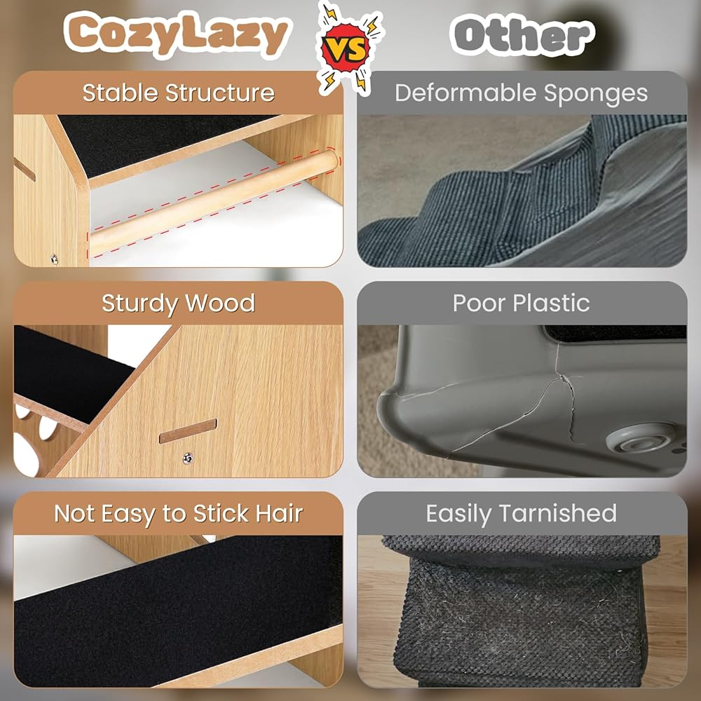 Stability and Not Deformed- Featuring an 'A' structure, the dog stairs ensure stability and prevents rocking on any floor surface. Sturdy wood can hold pets up to 70 pounds! It's not easy to deform and is more resistant than sponge step.