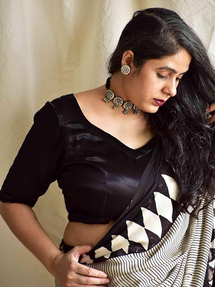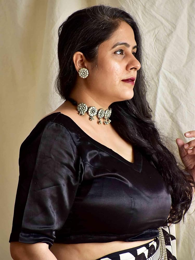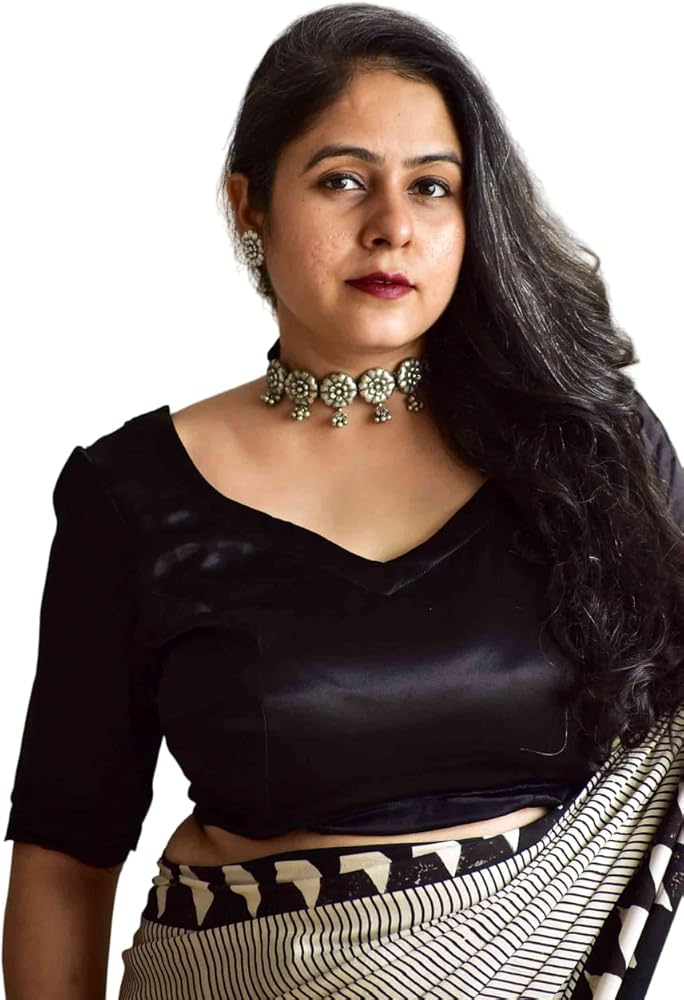 "Solid black colour Mashru silk blouse is the one you must have. This is one such versatile piece which can be teamed up with many sarees. Closure - Side zip 100% handmade with love in Indian villages."