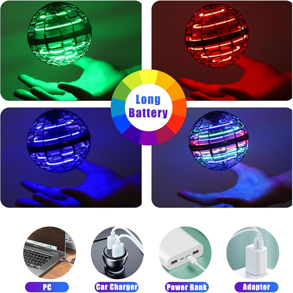 The flying sphere takes about 20 minutes to fully charge and works for 8-10 minutes. Supports charging methods such as computers, car chargers, and portable chargers. When the battery level is too low, the LED indicator light flashes; When charging, the red indicator light stays on and goes off after charging.