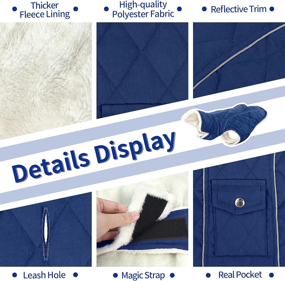 【تصميم كلاسيكي بلون موحد】توفر ملابسنا الكلاسيكية الدافئة للكلاب ذات اللون الصلب مع بطانة الصوف تغطية كاملة لحيوانك الأليف وتوفر أقصى قدر من الدفء ومجموعة كاملة من الحركة. مع لمسات تصميمية إضافية مثل الجيب الخلفي الحقيقي اللطيف، وفتحة المقود في الخلف. تتم إضافة شرائط عاكسة على جانبي السترة، والتي يسهل العثور عليها في الإضاءة المنخفضة