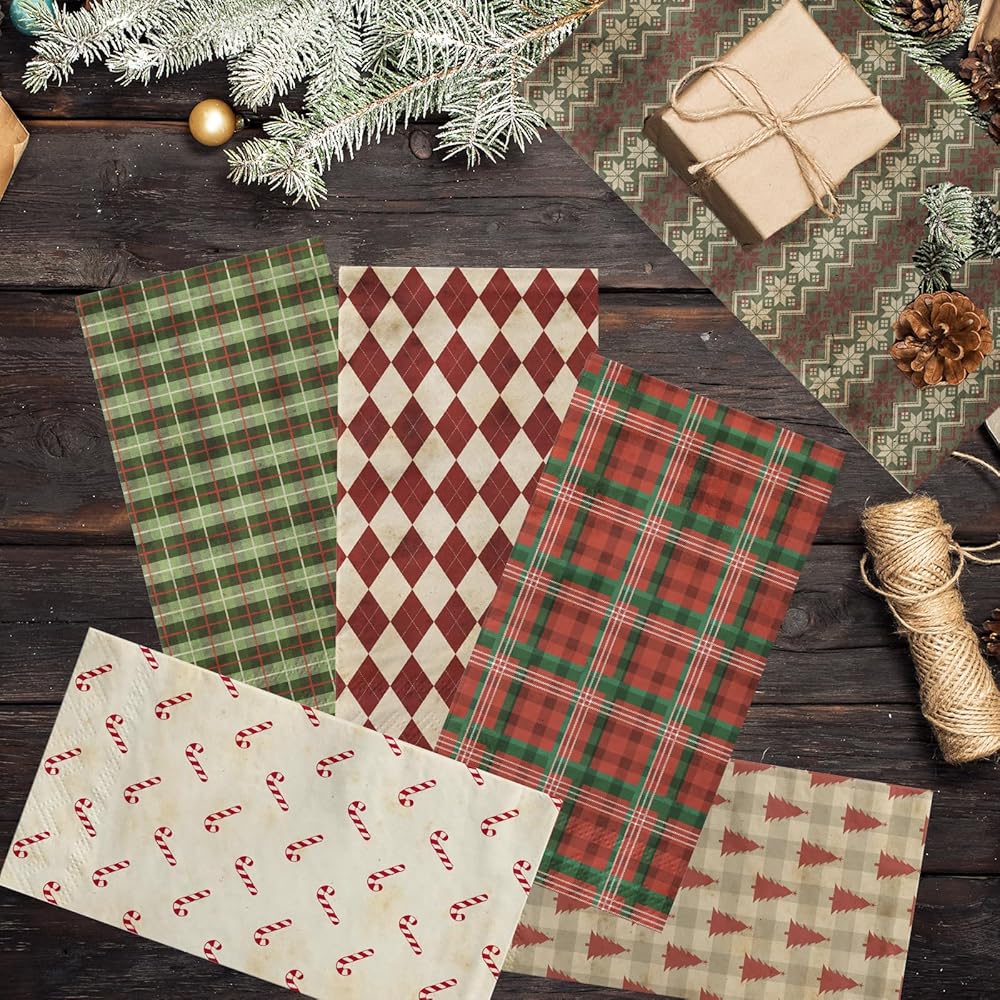 تصميم هندسي لعيد الميلاد: مناديل ضيوف عيد الميلاد هذه مصممة بعناصر عيد الميلاد مثل شجرة عيد الميلاد، ومع نقوش الجاموس كخلفية. أضف جوًا دافئًا لحفلة عيد الميلاد الخاصة بك، كما أنها مخصصة لحفلات استقبال المولود الجديد أو زينة حفلات عيد الميلاد