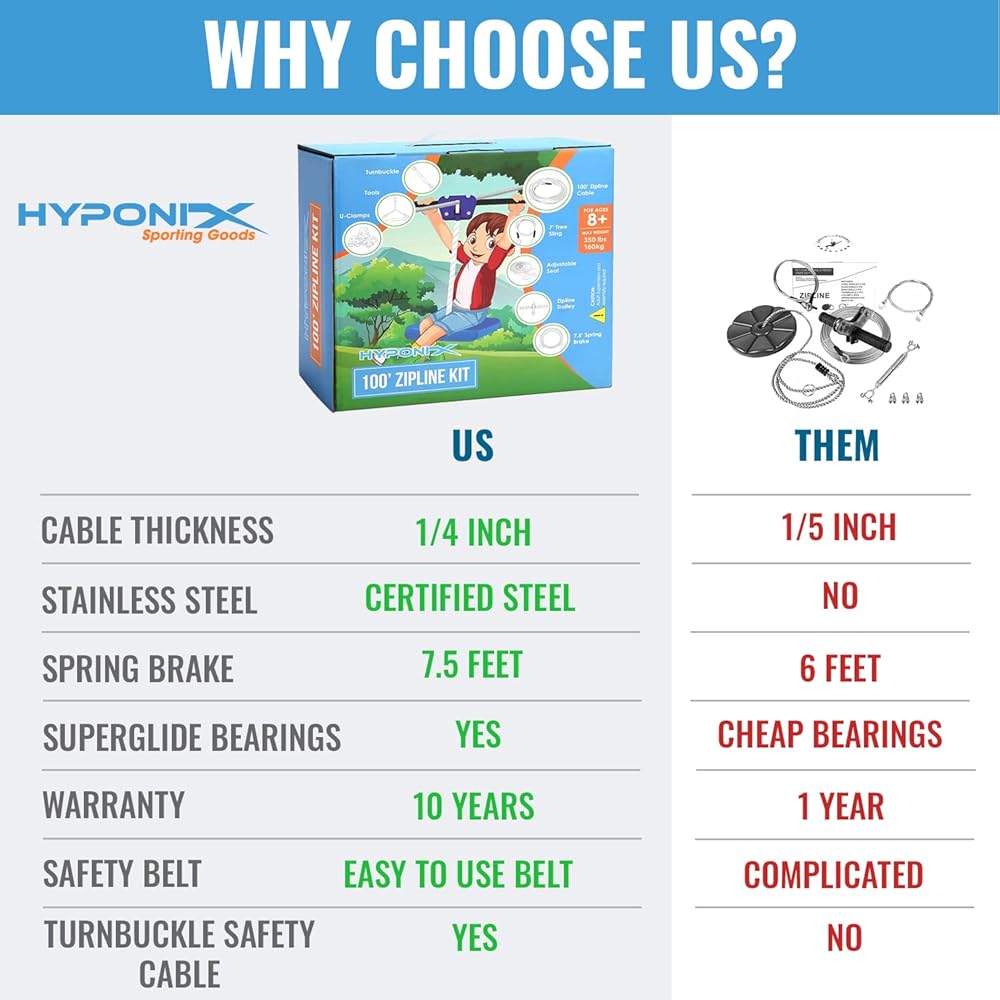 • مجموعة HYPONIX ZIPLINE... أخيرًا، طريقة آمنة وبأسعار معقولة للانزلاق بالحبل في الفناء الخلفي الخاص بك! سريعة وممتعة وبأسعار معقولة. مجموعة زيبلاين الخاصة بنا مصنوعة من مكونات فاخرة من الفولاذ المقاوم للصدأ تقاوم الصدأ والتآكل