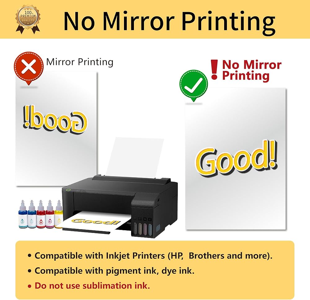 💕المتطلبات: طابعات نفث الحبر (مثل HP وBrother وغيرها من العلامات التجارية) | حبر الصباغ أو حبر الصبغ (لا تستخدم حبر التسامي) | مقص أو آلة قطع | ماكينة ضغط حديدي أو حراري | ورق تفلون (متضمن في العبوة).